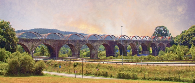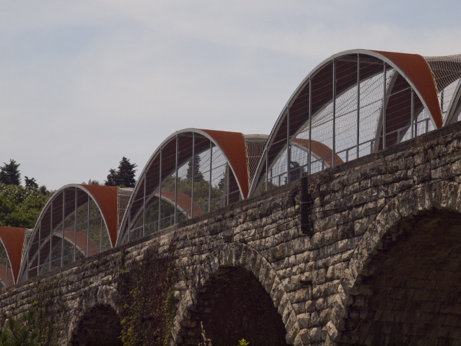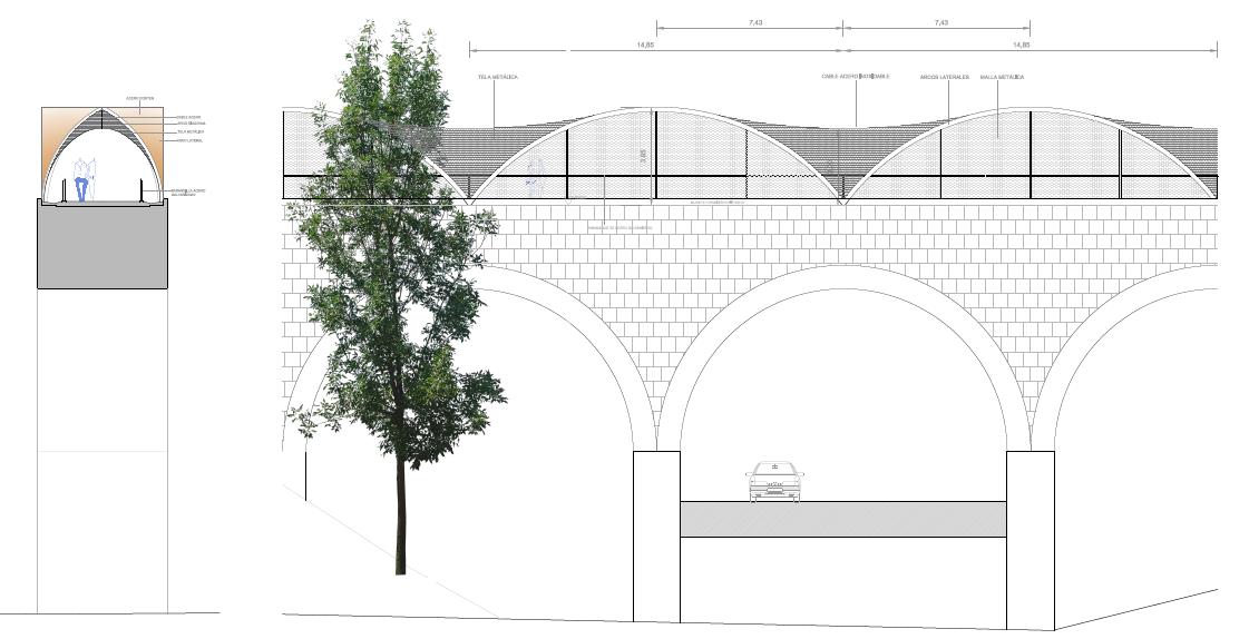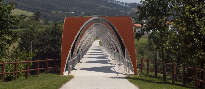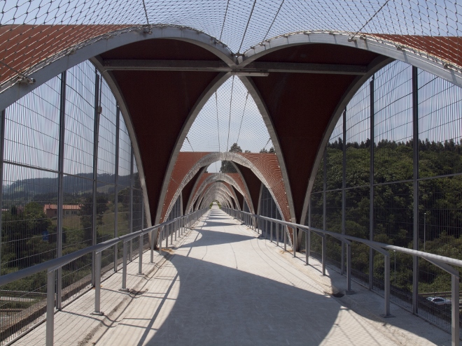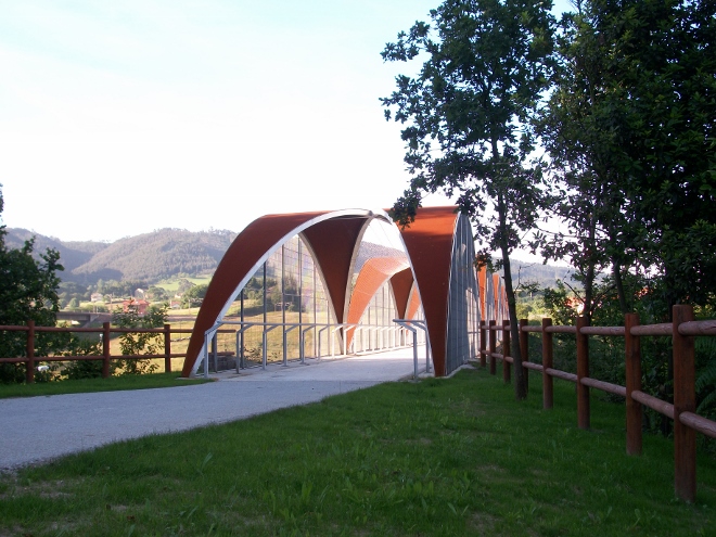 Se compone de una sucesión de once módulos que emulan un encadenamiento de vagones de tren, formados a partir de la disposición de unos arcos laterales de medio punto que se alternan con los del puente, coincidiendo sus apoyos sobre las claves de los arcos de éste, integrándose perfectamente al mantener su misma luz y ritmo. La transparencia de los cerramientos laterales de malla metálica (necesarios por cuestiones de seguridad) hace más ingrávida la presencia de esta nueva pieza sobre el puente, completando la composición del mismo sin cobrar demasiada presencia ni rivalizar materialmente con él. Junto a estos arcos laterales, el otro elemento que caracteriza y define el volumen es la catenaria, clara referencia al pasado ferroviario. Este cable, que adopta una forma curva por la acción de la gravedad al estar colgado entre dos soportes, genera, por revolución, un paraboloide hiperbólico de tela metálica de acero inoxidable, que junto al cerramiento de chapa corten define el espacio por el que circula la gente. Los materiales y técnicas utilizados en la construcción de la pasarela pretenden favorecer su integración en el puente, al tiempo que hacen referencia a la industria metalúrgica, tan importante en el triángulo geográfico que forman Gijón, Oviedo y Avilés. De esta manera, el acero se convierte en el gran protagonista, utilizado con diferentes tratamientos de protección en función de la posición y misión de cada elemento (acero corten, galvanizado o inoxidable), pretendiendo con ello reducir costes de mantenimiento en un entorno agresivo. Por otra parte, la pasarela pretende ser un elemento representativo que complete la configuración de esta gran puerta de entrada al concejo de Gijón desde el occidente asturiano. La composición escultórica del conjunto, así como su privilegiada situación y calidad arquitectónica, hacen de este elemento un buen cartel de bienvenida a Gijón, ya que cada día pasan bajo él miles de personas. |