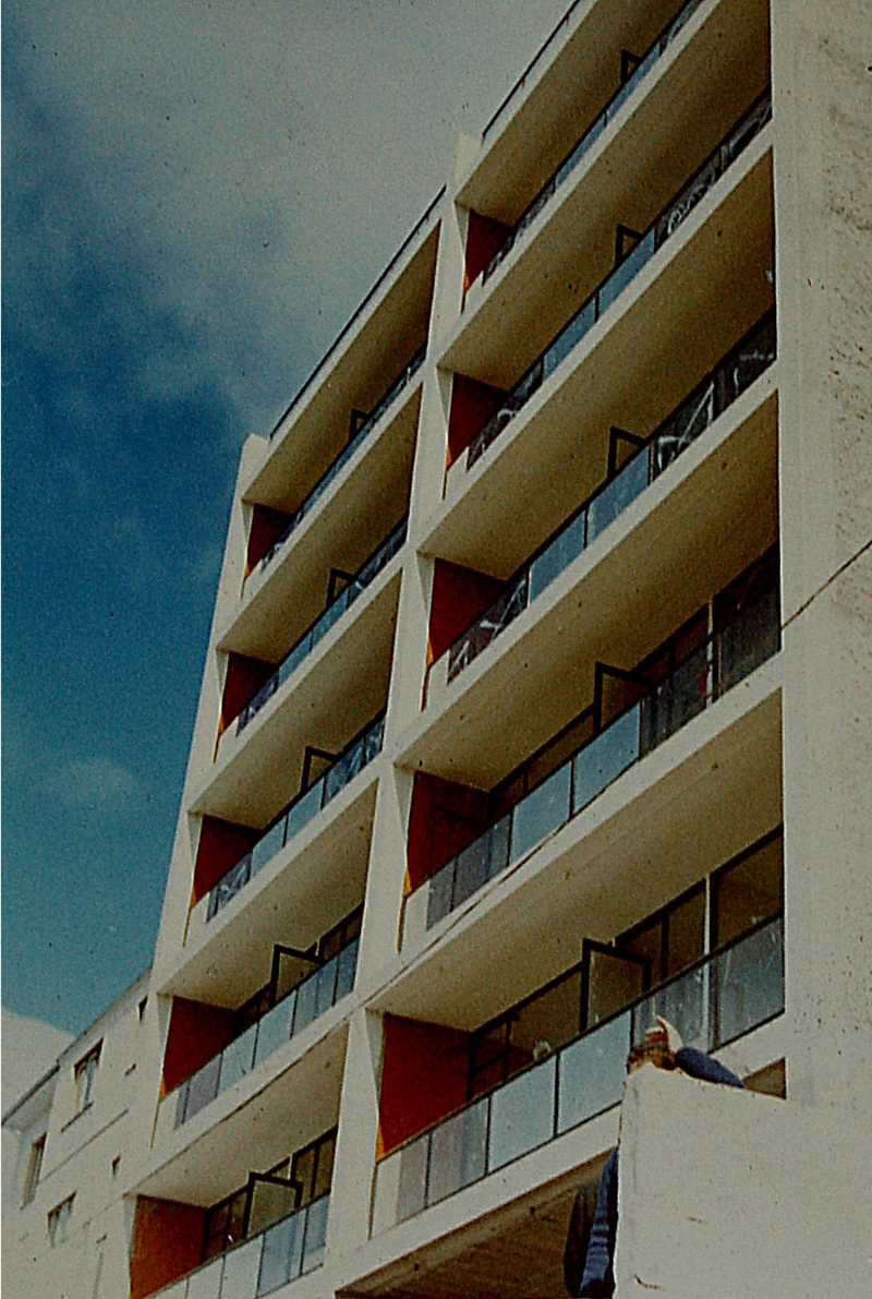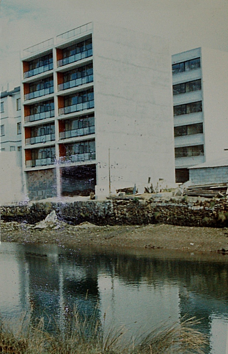 | Otro buen ejemplo de puesta en práctica del sistema Panal*, en este caso dos bloques que comparten acceso situados en Navia.Las imágenes ofrecen el estado de las edificaciones en un tiempo cercano a la terminación de la obra, mostrando una gran limpieza formal, unos prismas perfectos, con una ligera carpintería de color negro que cubría la totalidad de los huecos, buscando una relación fluida entre interior y exterior. En terrazas una barandilla del mismo color y con vidrio como material del mismo color y con vidrio como material de protección, sugieren una imagen abstracta de la edificación, a la que le da un toque cálido la gama de colores ocres oscuros utilizados en la zona interior de las terrazas. Aunque la imagen que se ve en las fotos se podría haber terminado hoy, por desgracia no se ha mantenido la misma, habiéndose cerrado la mayor parte de los huecos por parte de los propietarios sin ningún rigor ni continuidad formal, lo que ofrece en la actualidad, una imagen lamentable de los edificios.