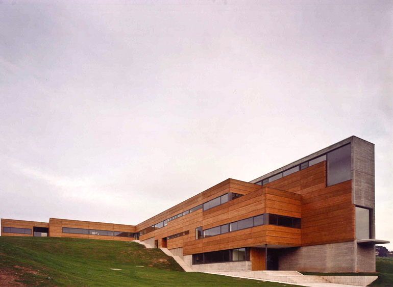 | «Era necesario resolver el edificio en una parcela con 12 mts de desnivel, lo que se resuelve con una calle/rampa descendente desde el acceso principal y ubicada en un lateral, como se refleja en el muro de hormigón. El resto del programa parte de esa premisa, procurando orden y paz interior a través de varios patios. El magnífico edificio de La Laboral condiciona formas, materiales y altura.»Arturo Gutiérrez de Terán | ||