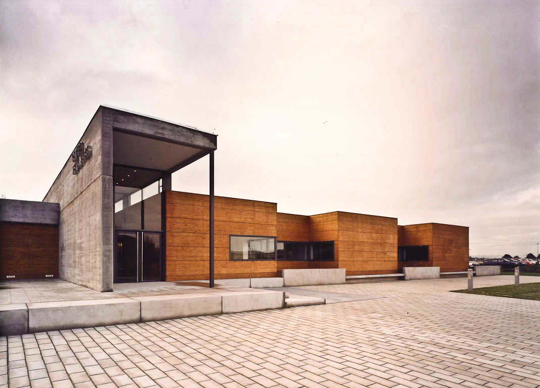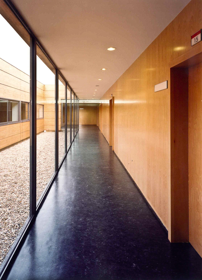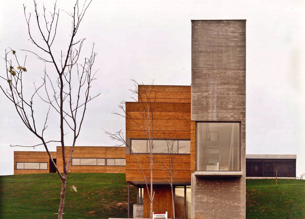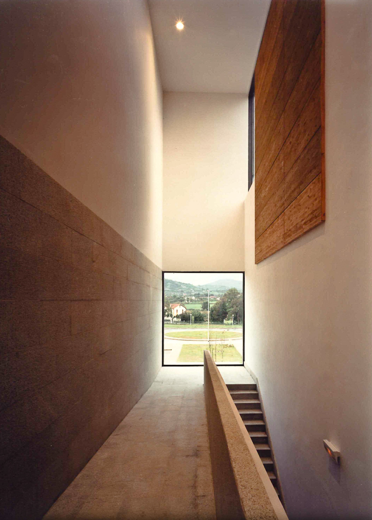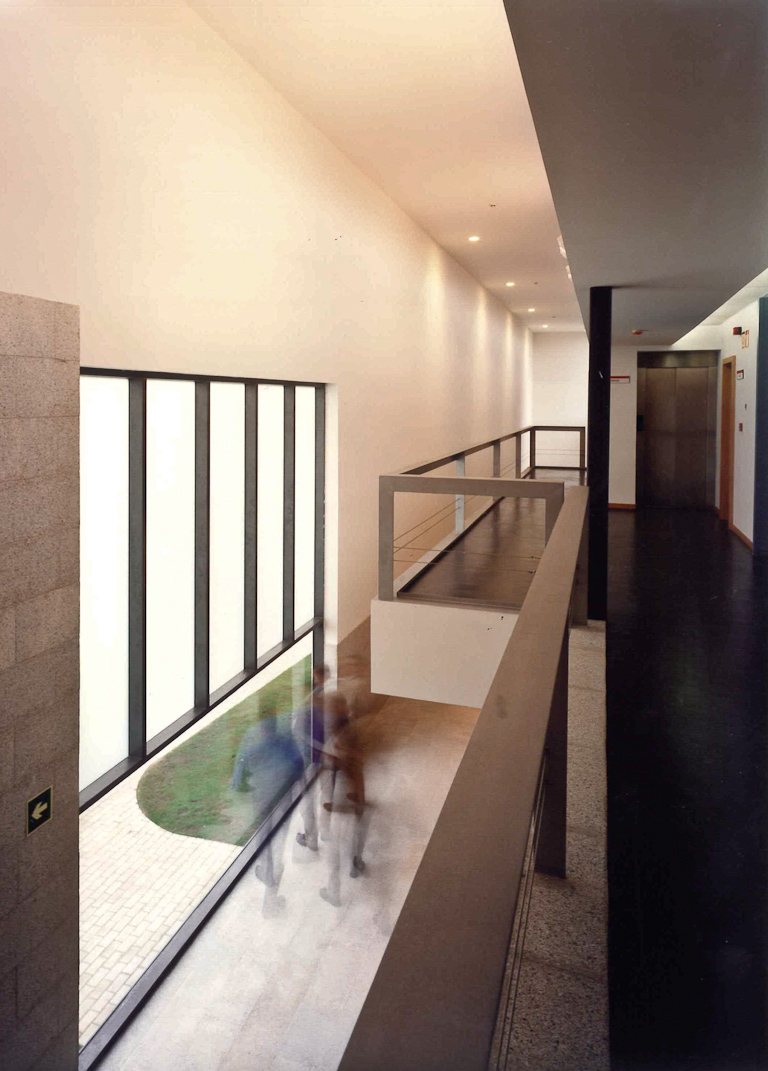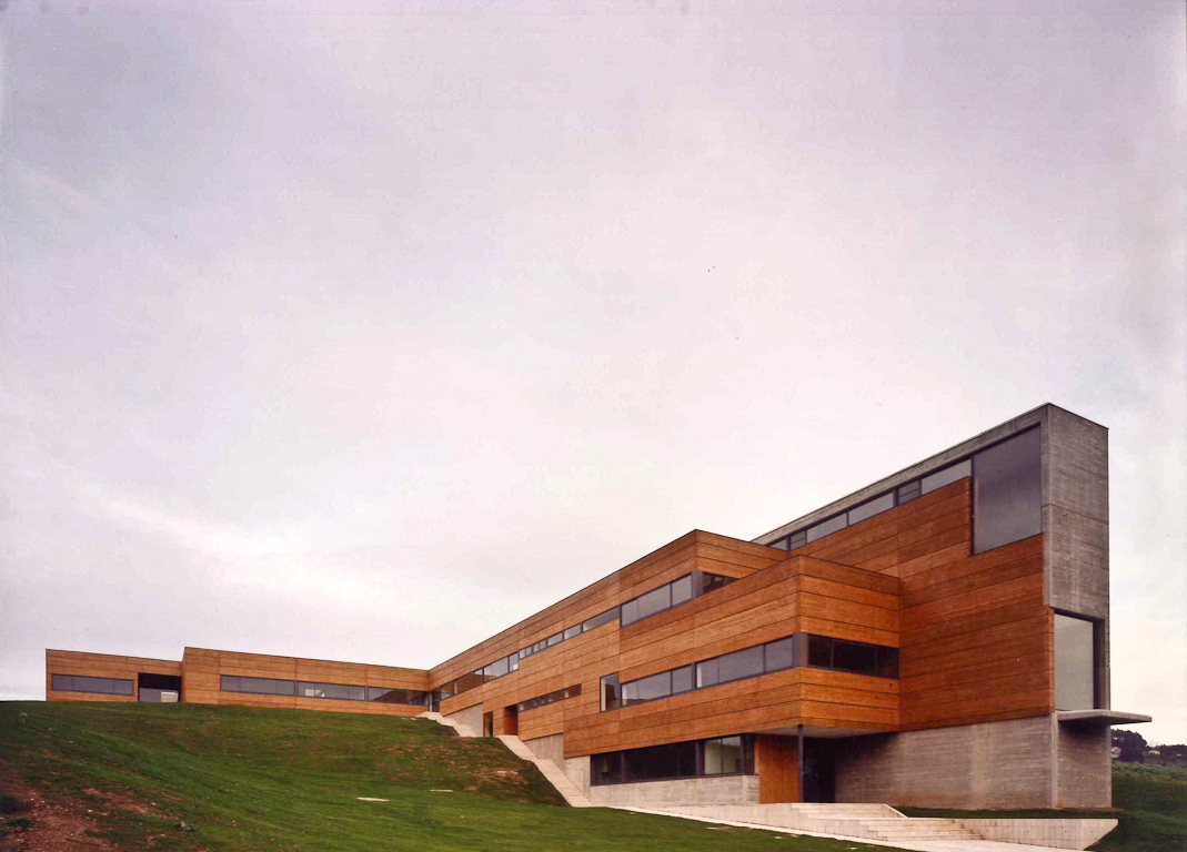 | «Era necesario resolver el edificio en una parcela con 12 mts de desnivel, lo que se resuelve con una calle/rampa descendente desde el acceso principal y ubicada en un lateral, como se refleja en el muro de hormigón. El resto del programa parte de esa premisa, procurando orden y paz interior a través de varios patios. El magnífico edificio de La Laboral condiciona formas, materiales y altura.»Arturo Gutiérrez de Terán | ||