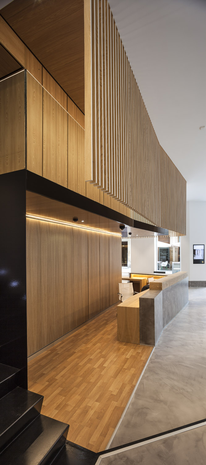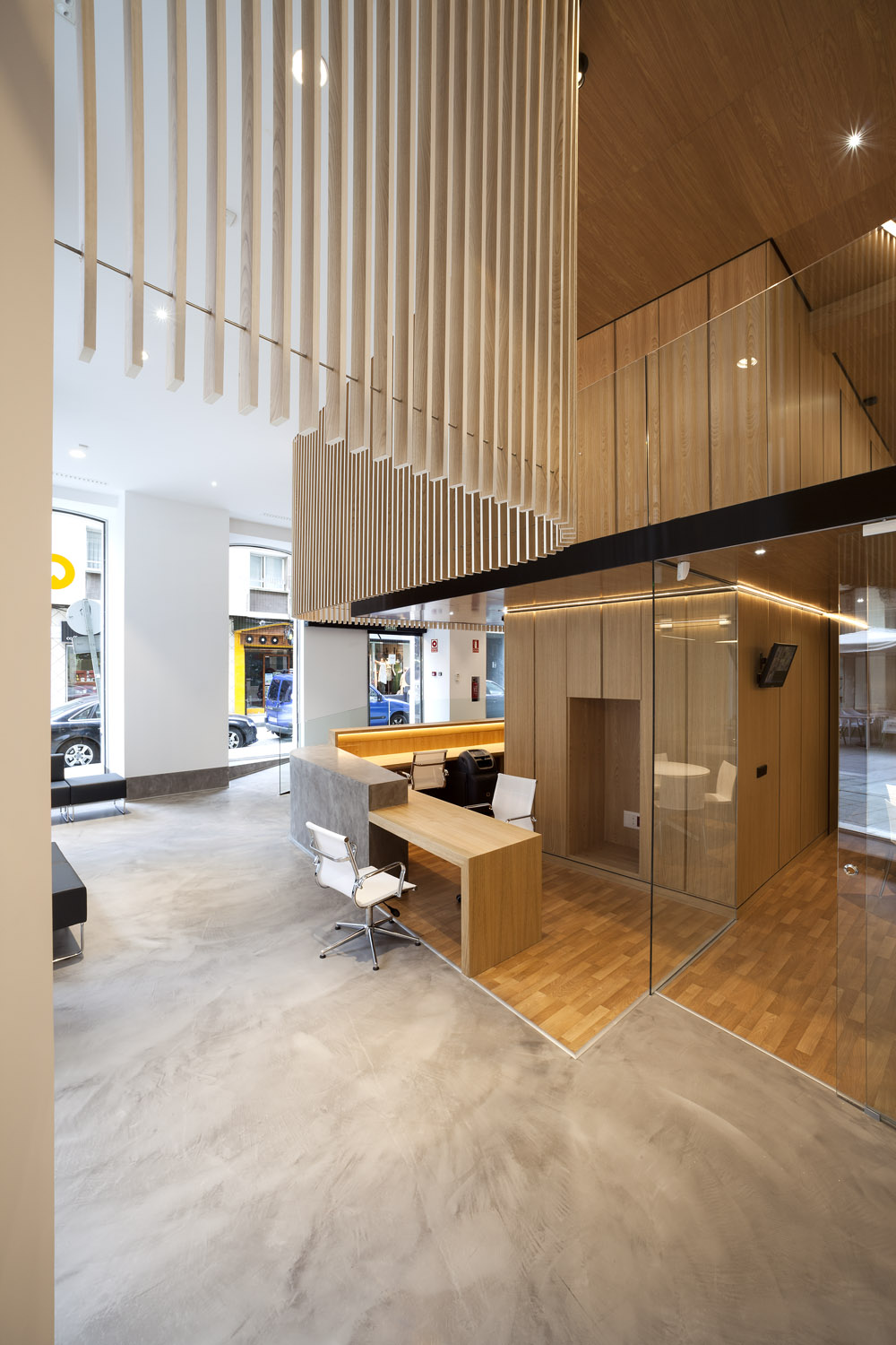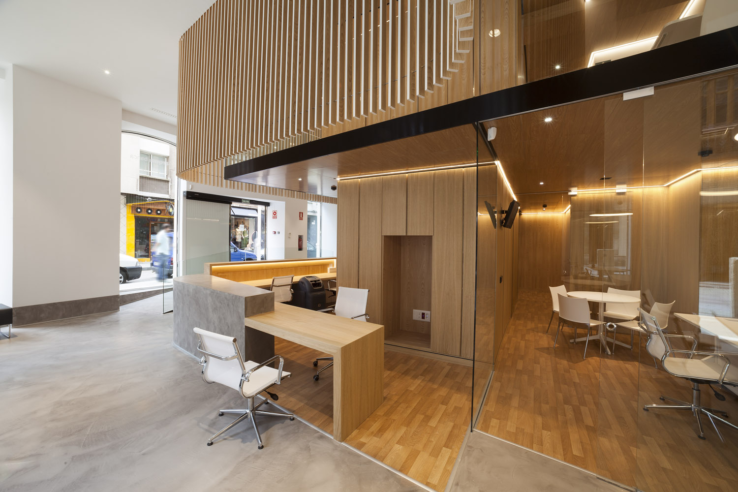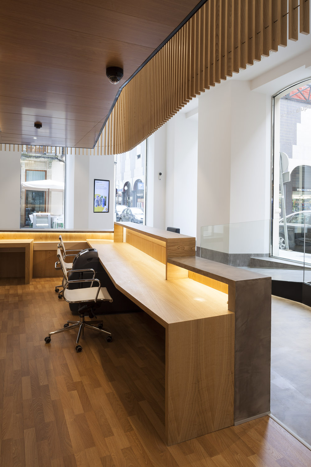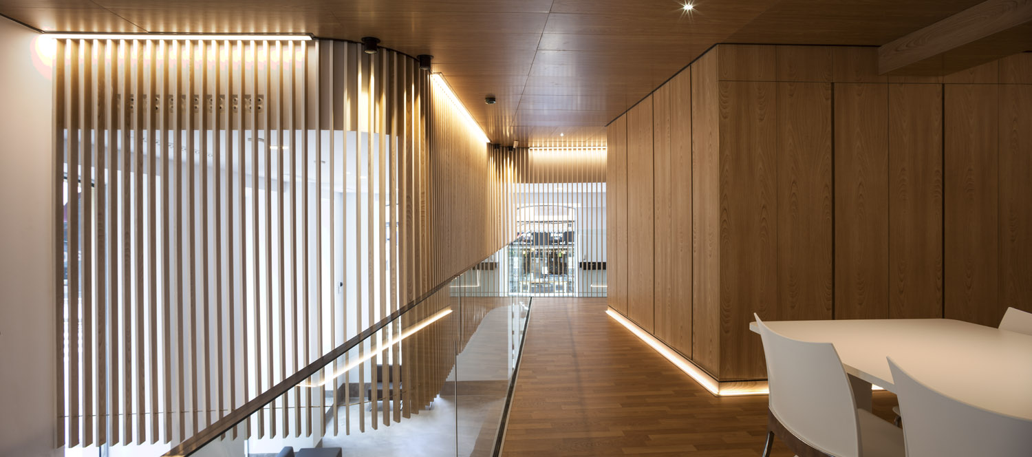 «El diseño único siempre ha sido uno de los elementos distintivos de esta entidad. Cada oficina es distinta, y eso marca la diferencia respecto a la estandarización que muestra el sector» Mariano Muixí, director general ARQUIA BANCA. El local en planta baja forma parte de un edificio de 1895 con protección urbanística que impide cualquier tipo de alteración en los huecos y color existentes. Por esta razón el proyecto se concibe como un objeto interior, independiente de la fachada y visible a través de la misma. El programa se ha organizado de forma concéntrica, generando áreas superpuestas según su carácter: público, privado y confidencial. La altura libre disponible ha permitido el aprovechamiento del espacio en vertical, ubicando en un nivel superior parte del programa y produciendo cambios de altura acordes al uso de las estancias. Tras la fachada se da paso a un ámbito amplio, luminoso y de materiales neutros que da protagonismo al área de atención: un entorno más acotado, con mayor privacidad y materiales cálidos, que integra un núcleo central solo accesible por el personal. Este núcleo a dos niveles funciona como una gran armario de madera de castaño que encierra instalaciones y estancias de uso exclusivo del personal. En el nivel inferior se sitúan el aseo, un cuarto de limpieza y el office administrativo. El nivel superior se configura como un corredor abierto que rodea el núcleo central, empleado como archivo y alojamiento de las instalaciones de climatización. La celosía suspendida cumple con la doble función de contorno delimitador y filtro del nivel superior. La madera de castaño es el material protagonista en este proyecto, aportando calidez y proximidad a modo de identidad corporativa. La climatización del local se ha integrado en el núcleo central de modo que los componentes de difusión y retorno del aire forman parte del despiece de la carpintería. |
