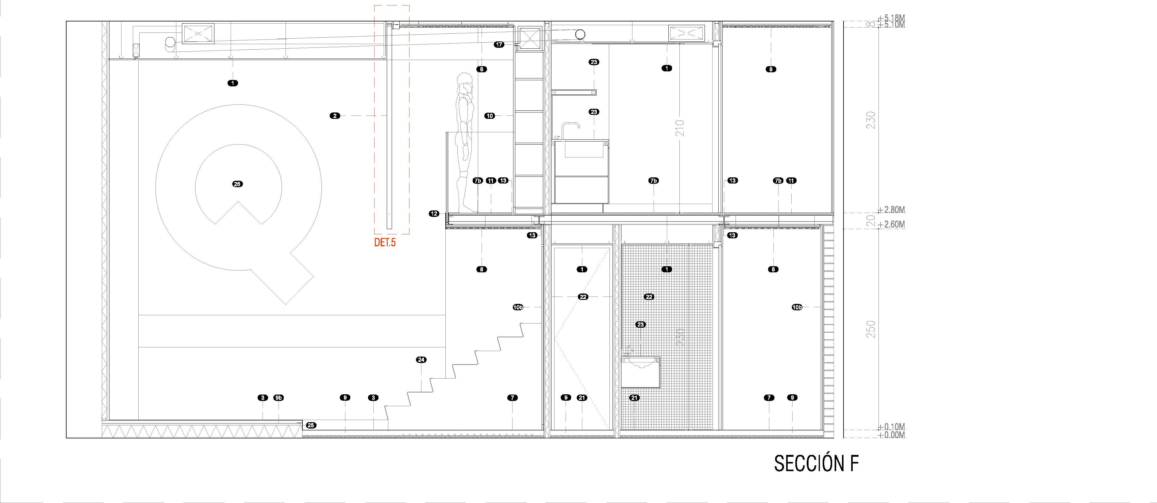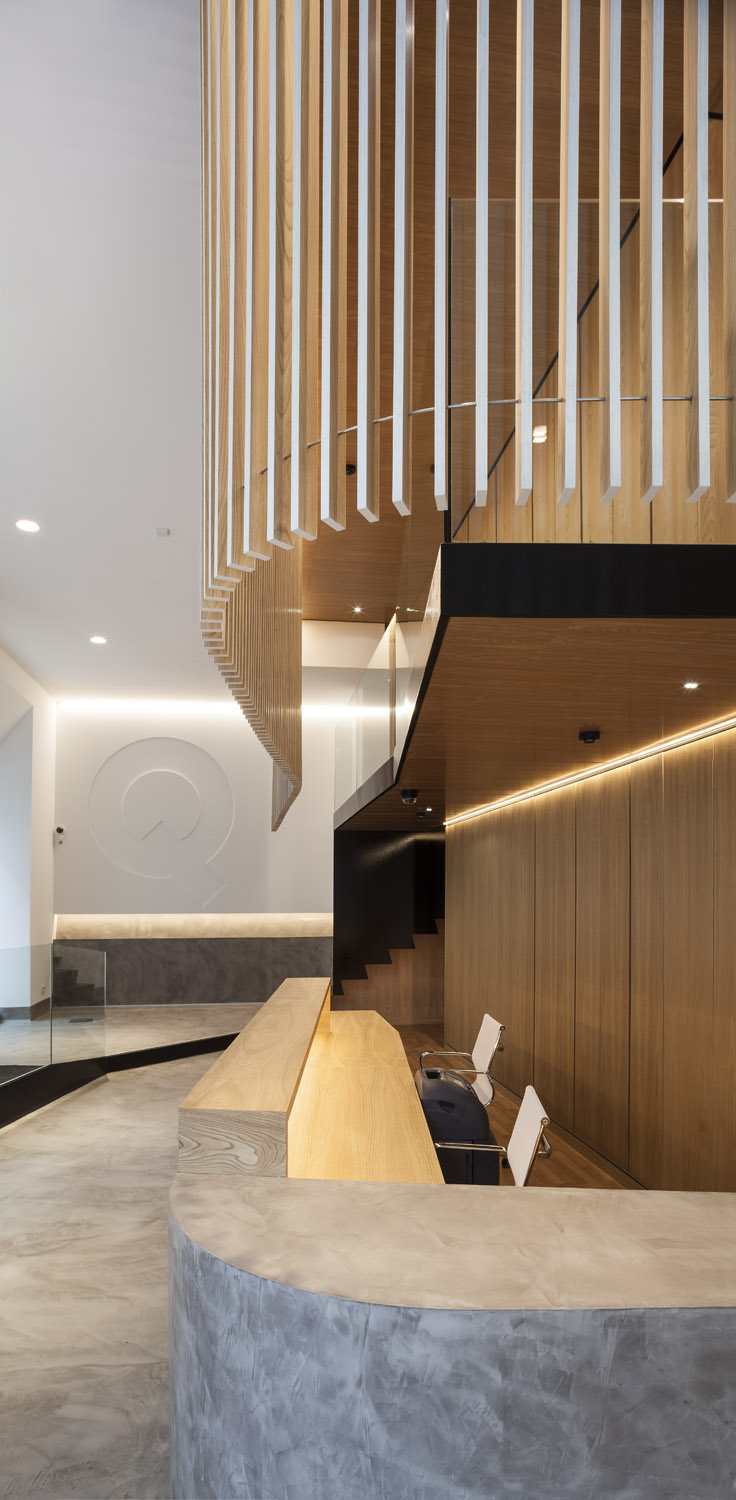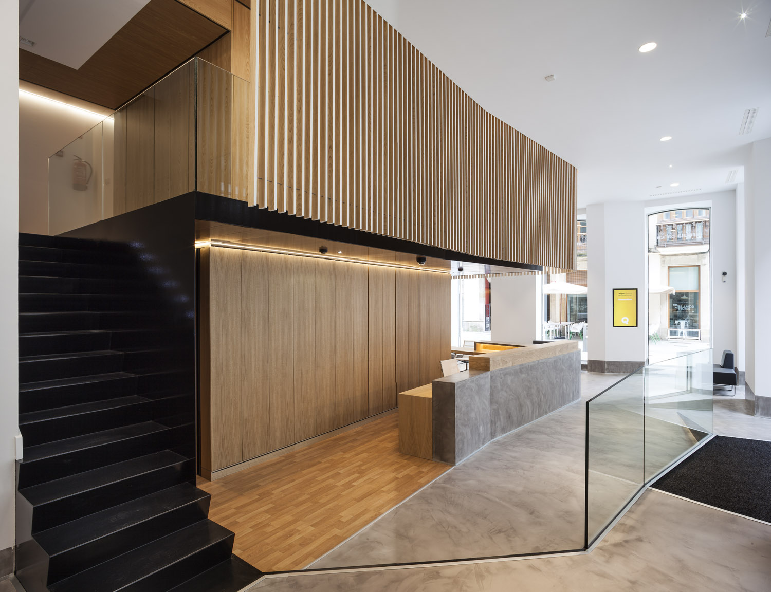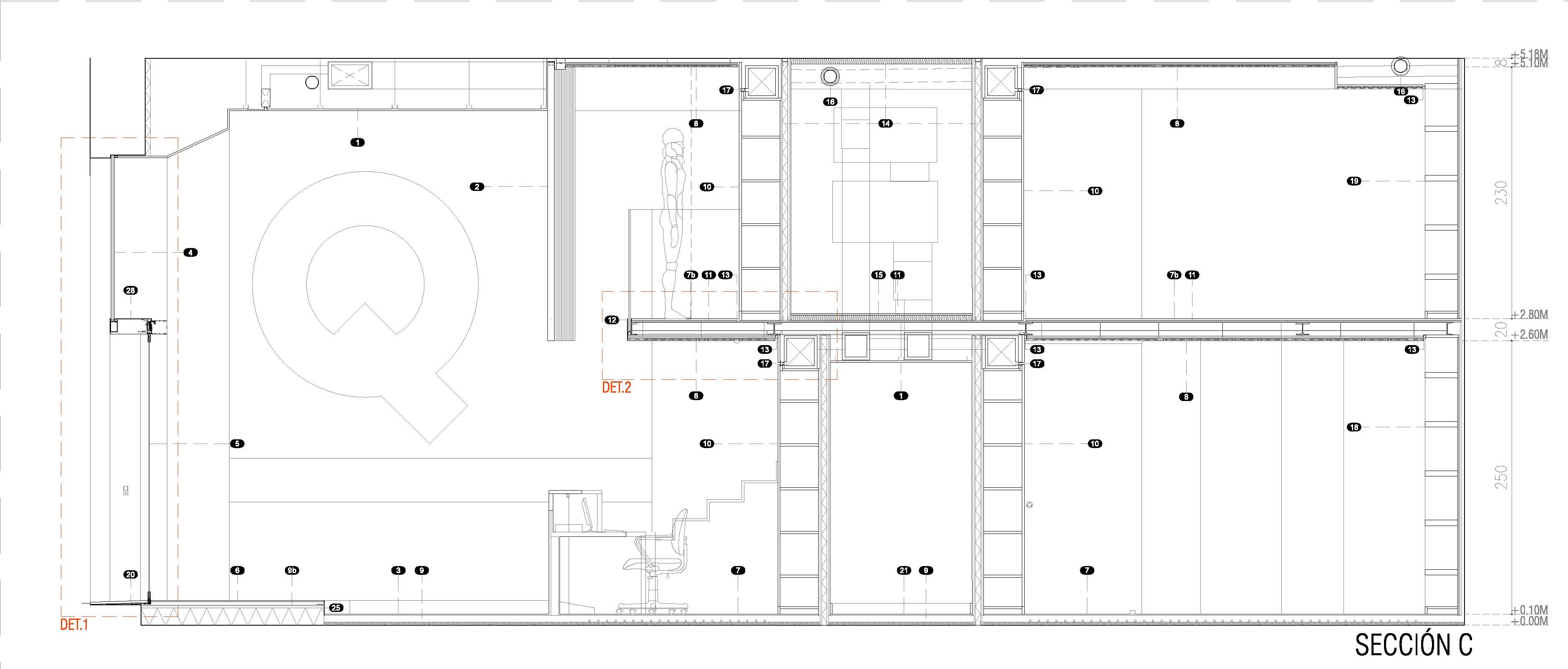 «El diseño único siempre ha sido uno de los elementos distintivos de esta entidad. Cada oficina es distinta, y eso marca la diferencia respecto a la estandarización que muestra el sector» Mariano Muixí, director general ARQUIA BANCA. El local en planta baja forma parte de un edificio de 1895 con protección urbanística que impide cualquier tipo de alteración en los huecos y color existentes. Por esta razón el proyecto se concibe como un objeto interior, independiente de la fachada y visible a través de la misma. El programa se ha organizado de forma concéntrica, generando áreas superpuestas según su carácter: público, privado y confidencial. La altura libre disponible ha permitido el aprovechamiento del espacio en vertical, ubicando en un nivel superior parte del programa y produciendo cambios de altura acordes al uso de las estancias. Tras la fachada se da paso a un ámbito amplio, luminoso y de materiales neutros que da protagonismo al área de atención: un entorno más acotado, con mayor privacidad y materiales cálidos, que integra un núcleo central solo accesible por el personal. Este núcleo a dos niveles funciona como una gran armario de madera de castaño que encierra instalaciones y estancias de uso exclusivo del personal. En el nivel inferior se sitúan el aseo, un cuarto de limpieza y el office administrativo. El nivel superior se configura como un corredor abierto que rodea el núcleo central, empleado como archivo y alojamiento de las instalaciones de climatización. La celosía suspendida cumple con la doble función de contorno delimitador y filtro del nivel superior. La madera de castaño es el material protagonista en este proyecto, aportando calidez y proximidad a modo de identidad corporativa. La climatización del local se ha integrado en el núcleo central de modo que los componentes de difusión y retorno del aire forman parte del despiece de la carpintería. |