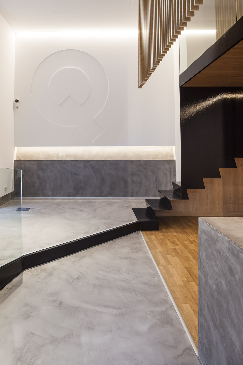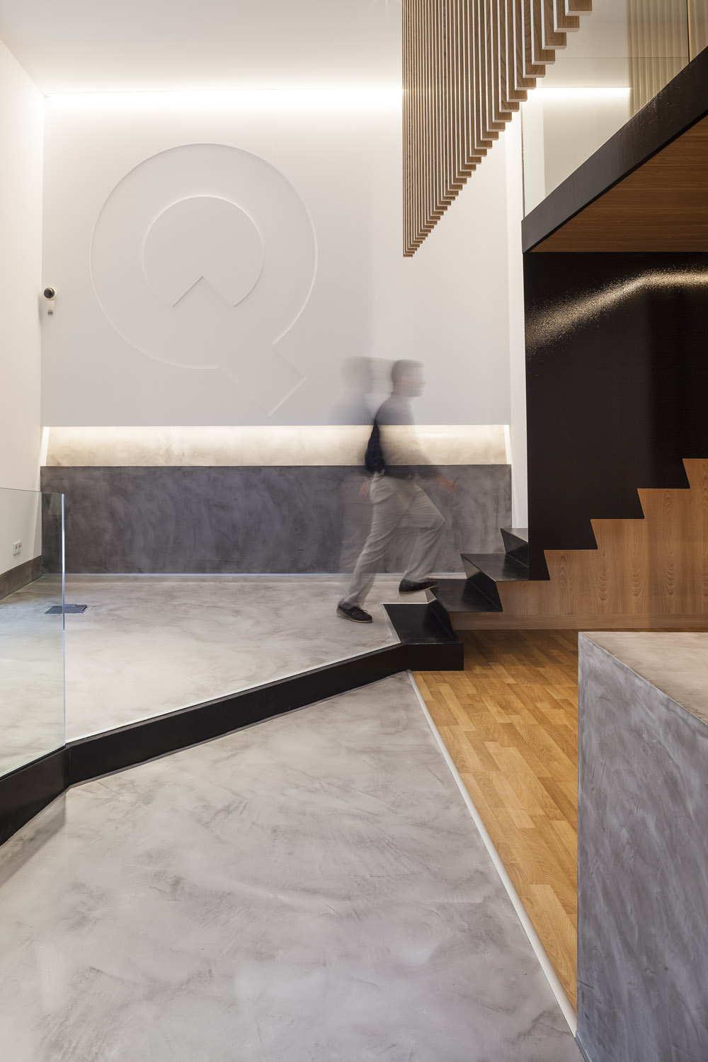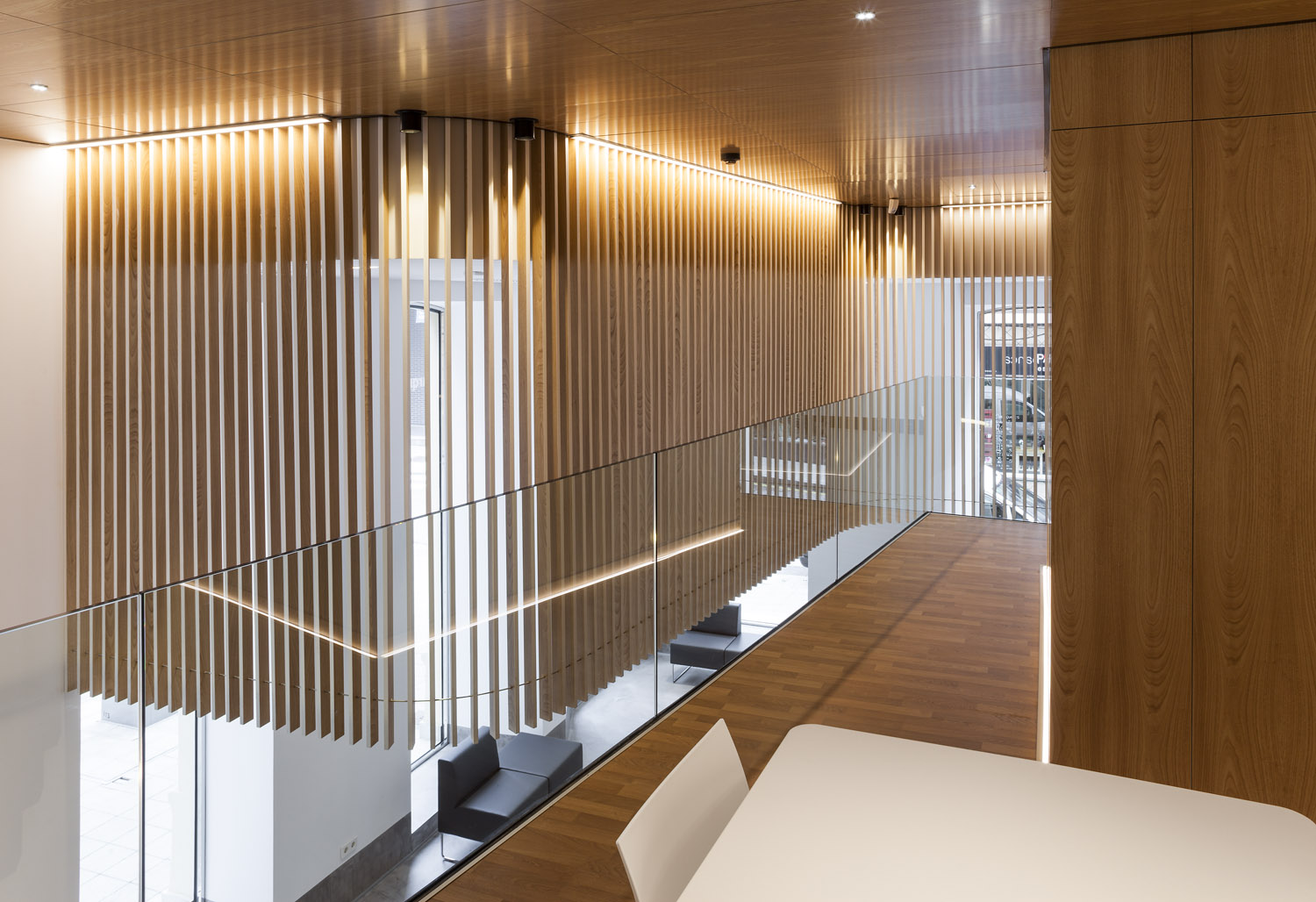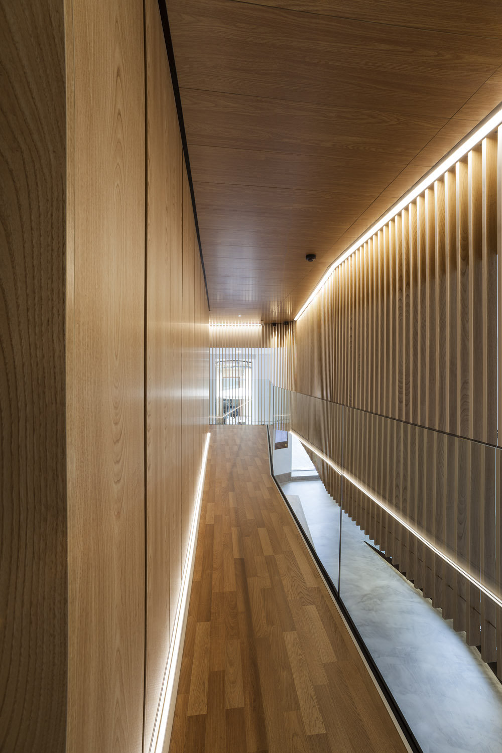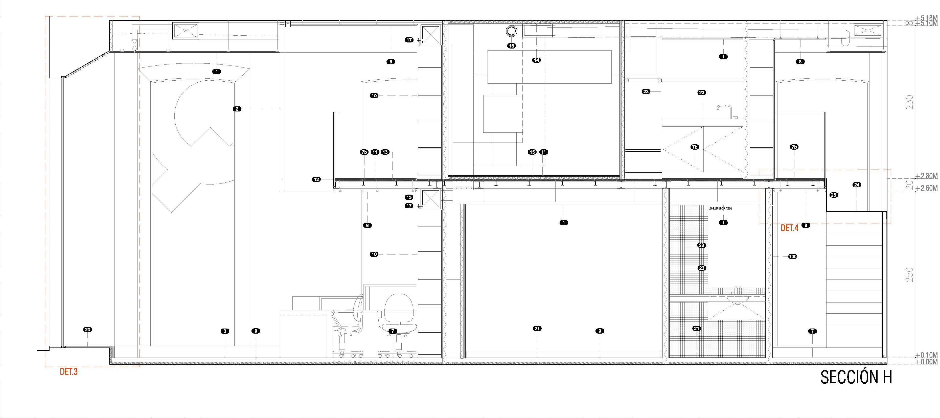 «El diseño único siempre ha sido uno de los elementos distintivos de esta entidad. Cada oficina es distinta, y eso marca la diferencia respecto a la estandarización que muestra el sector» Mariano Muixí, director general ARQUIA BANCA. El local en planta baja forma parte de un edificio de 1895 con protección urbanística que impide cualquier tipo de alteración en los huecos y color existentes. Por esta razón el proyecto se concibe como un objeto interior, independiente de la fachada y visible a través de la misma. El programa se ha organizado de forma concéntrica, generando áreas superpuestas según su carácter: público, privado y confidencial. La altura libre disponible ha permitido el aprovechamiento del espacio en vertical, ubicando en un nivel superior parte del programa y produciendo cambios de altura acordes al uso de las estancias. Tras la fachada se da paso a un ámbito amplio, luminoso y de materiales neutros que da protagonismo al área de atención: un entorno más acotado, con mayor privacidad y materiales cálidos, que integra un núcleo central solo accesible por el personal. Este núcleo a dos niveles funciona como una gran armario de madera de castaño que encierra instalaciones y estancias de uso exclusivo del personal. En el nivel inferior se sitúan el aseo, un cuarto de limpieza y el office administrativo. El nivel superior se configura como un corredor abierto que rodea el núcleo central, empleado como archivo y alojamiento de las instalaciones de climatización. La celosía suspendida cumple con la doble función de contorno delimitador y filtro del nivel superior. La madera de castaño es el material protagonista en este proyecto, aportando calidez y proximidad a modo de identidad corporativa. La climatización del local se ha integrado en el núcleo central de modo que los componentes de difusión y retorno del aire forman parte del despiece de la carpintería. |
