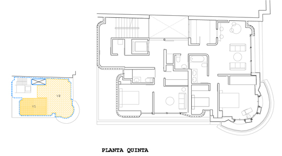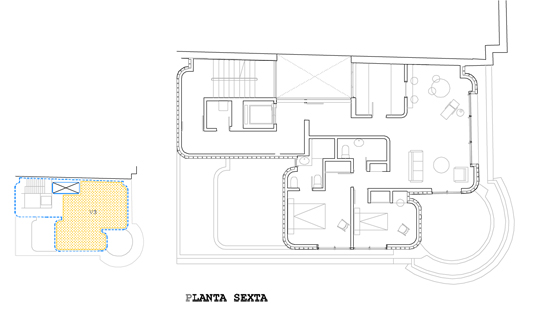 Se siguen las leyes compositivas del la parte histórica, retranqueando el nuevo volumen para diferenciarlo y enmarcar la independencia del torreón. El edificio existente, sigue teniendo su autonomía y el nuevo completa la manzana en el sentido de la Calle Uría y cae de manera escalonada hacia la Calle Fray Ceferino. La construcción del nuevo volumen se realiza con pavés y estructura metálica, así, la materia se convierte en reflejo de cada época además de conseguir cierta des-materialización visual del volumen. La contemporaneidad del nuevo volumen se traslada también al interior, deslizándose por el patio interior hasta la planta sótano, consiguiendo una integración total entre ambas épocas. |