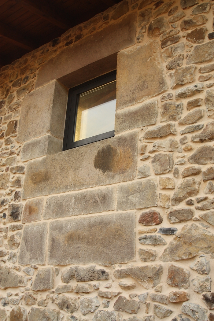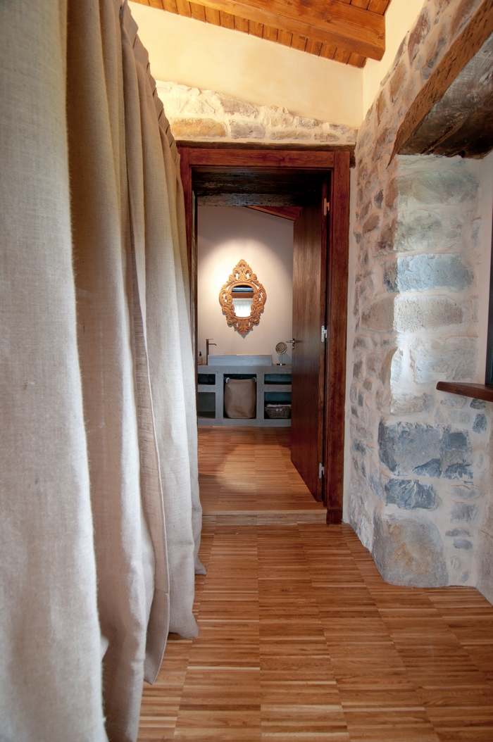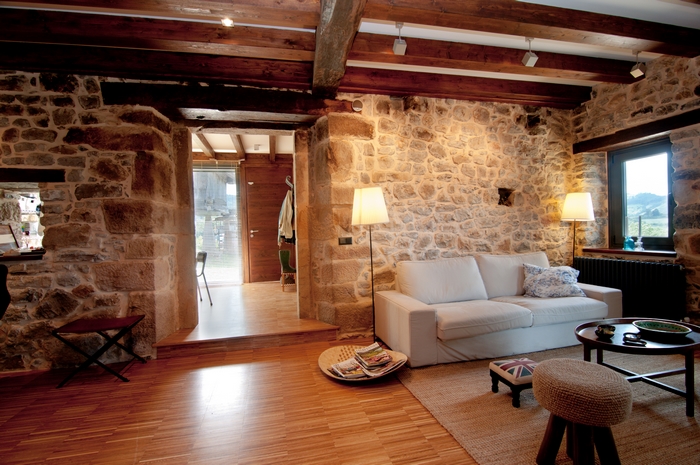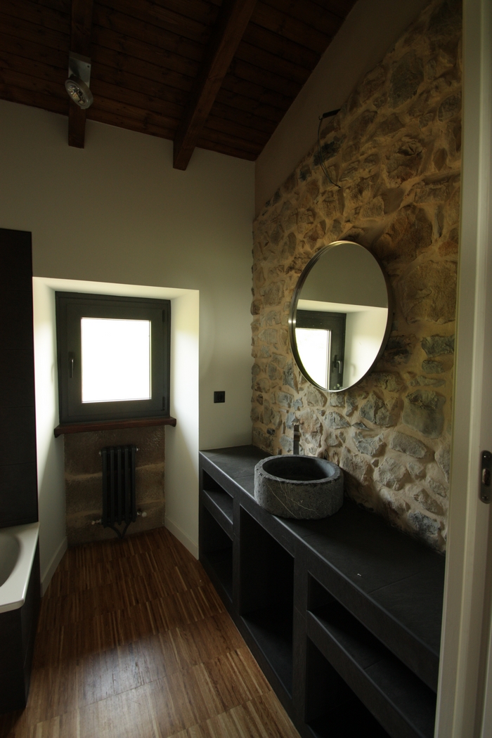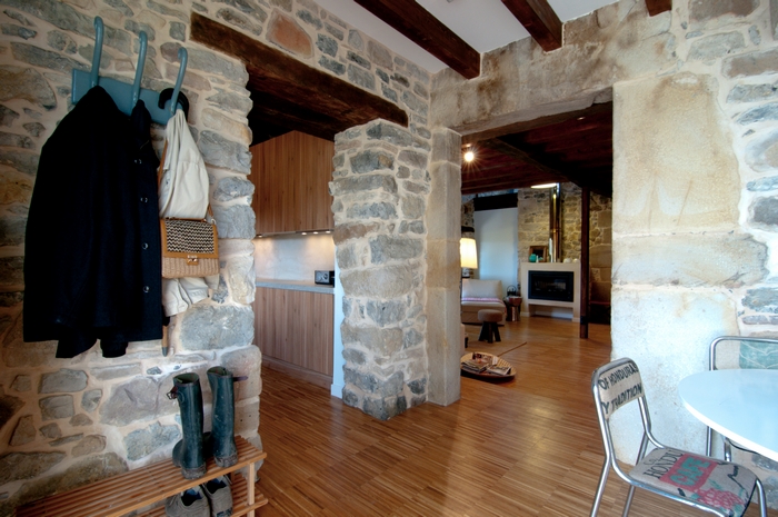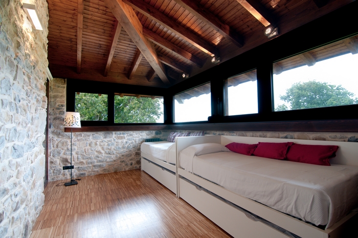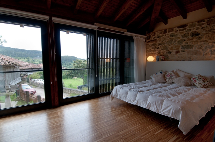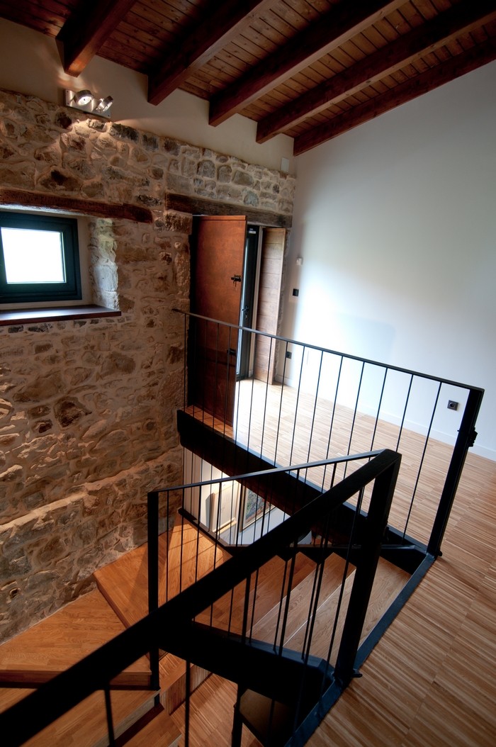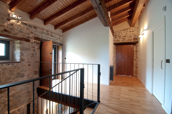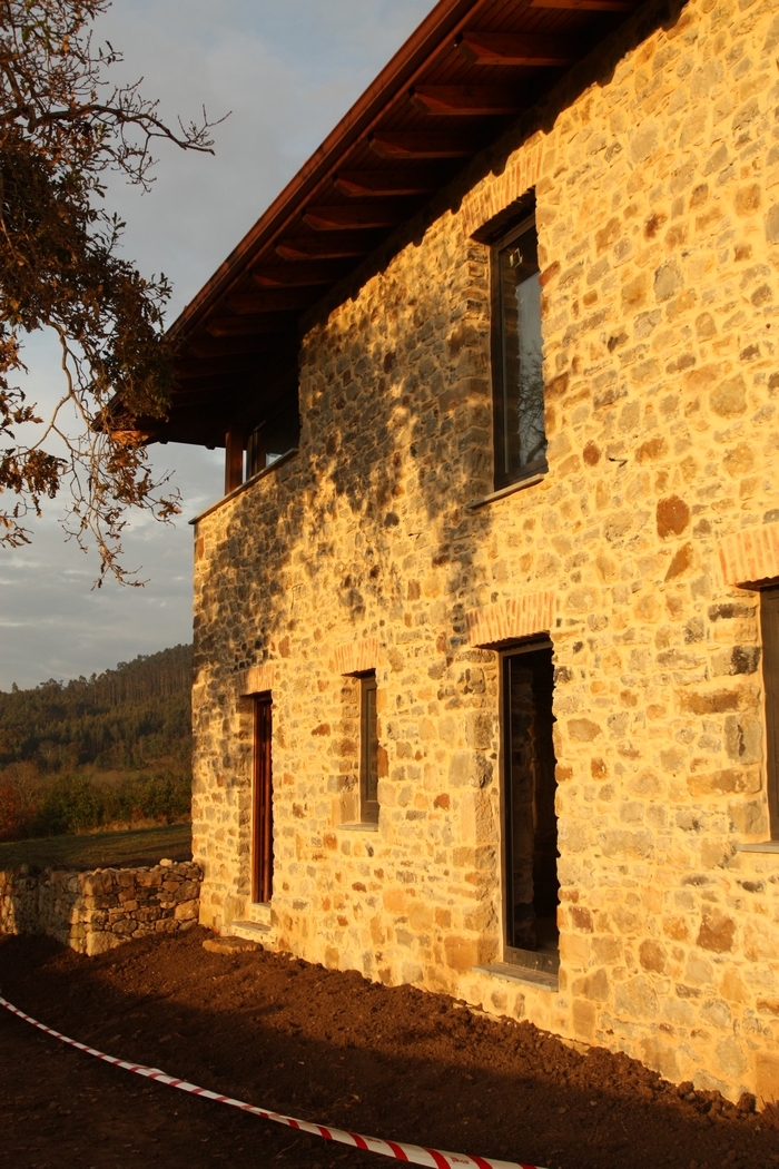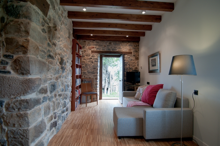 La intervención procura no alterar la composición y estabilidad del edificio, de modo que se plantea conservar los huecos existentes y recuperar antiguos huecos cegados. Volumétricamente, el único cambio consiste en resolver la cubierta de forma unitaria, mediante cuatro aguas. Esta solución permite incluir en el alzado norte y oeste un gran hueco horizontal entre la coronación del muro y la línea del nuevo alero. En corredor sur se integra en el programa de la vivienda como una galería recubierta de un enlistonado de madera practicable, en un lenguaje que recuerda a su uso anterior como pajar o tenada. Se recupera el volumen de la escalera exterior desaparecida para albergar las nuevas instalaciones de la vivienda. Con el objetivo de respetar la configuración original, se mantienen las cotas del forjado preexistente, reutilizando los mechinales en los muros y las principales piezas estructurales de madera en buen estado. La reutilización del material original se lleva incluso a la cubierta, en el que las tejas originales, son desmontadas, comprobadas y de nuevo instaladas en la cubierta restaurada. Las particiones interiores se realizan mediante tabiquería ligera y los forjados y cubierta nueva serán de madera, como las existentes. Todo ello para evitar sobrecargar la estructura original. |