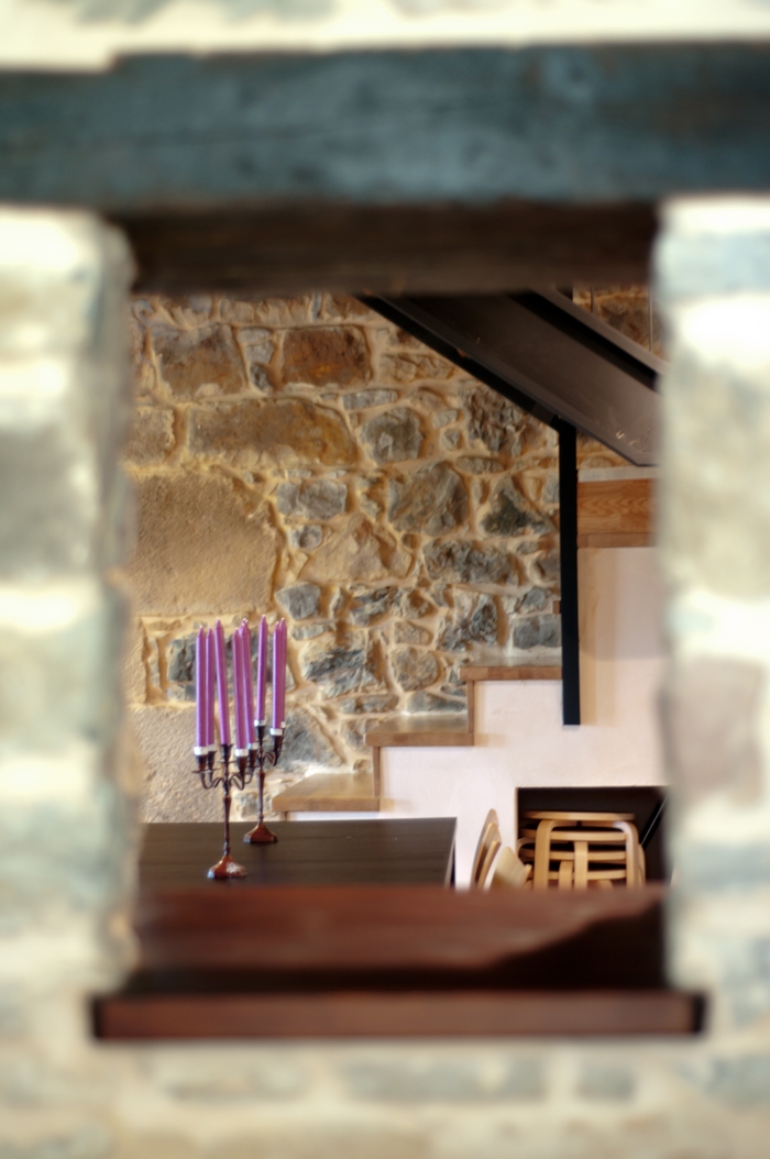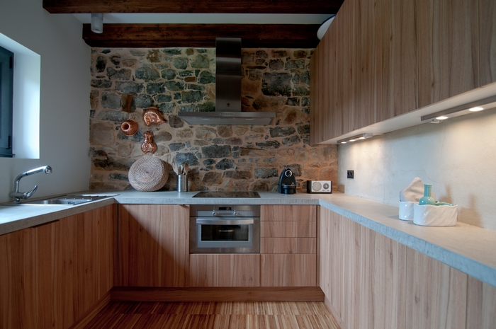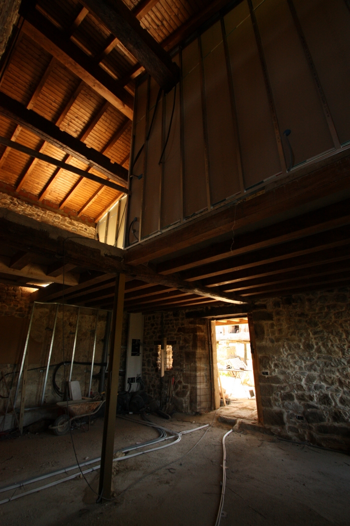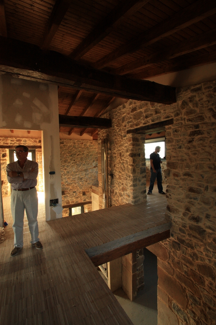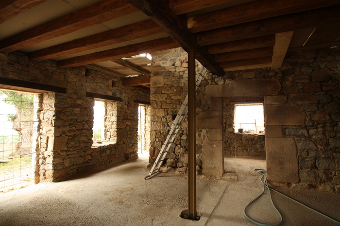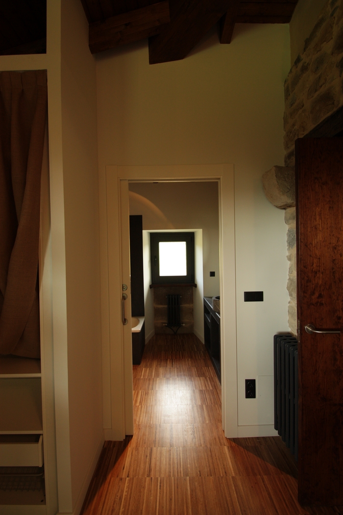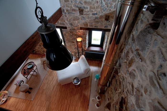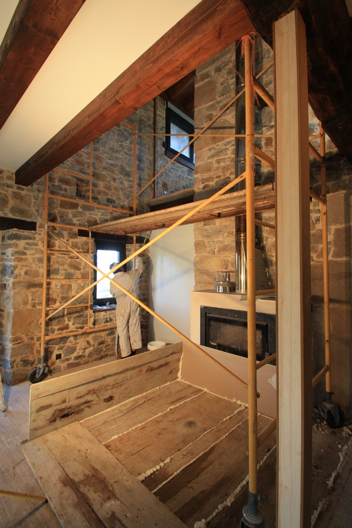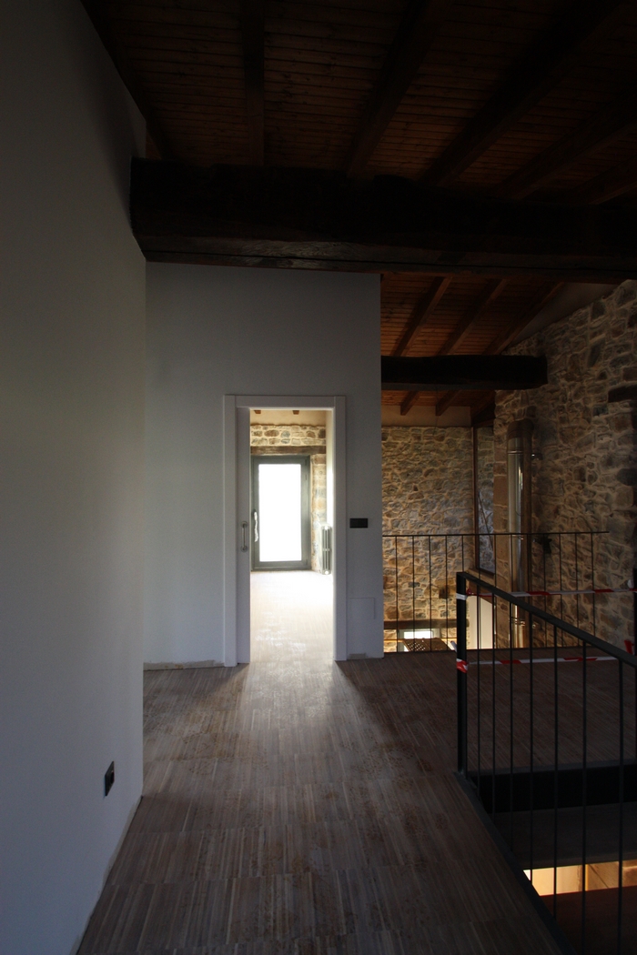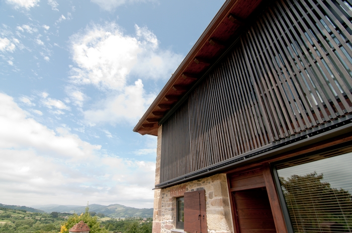 La intervención procura no alterar la composición y estabilidad del edificio, de modo que se plantea conservar los huecos existentes y recuperar antiguos huecos cegados. Volumétricamente, el único cambio consiste en resolver la cubierta de forma unitaria, mediante cuatro aguas. Esta solución permite incluir en el alzado norte y oeste un gran hueco horizontal entre la coronación del muro y la línea del nuevo alero. En corredor sur se integra en el programa de la vivienda como una galería recubierta de un enlistonado de madera practicable, en un lenguaje que recuerda a su uso anterior como pajar o tenada. Se recupera el volumen de la escalera exterior desaparecida para albergar las nuevas instalaciones de la vivienda. Con el objetivo de respetar la configuración original, se mantienen las cotas del forjado preexistente, reutilizando los mechinales en los muros y las principales piezas estructurales de madera en buen estado. La reutilización del material original se lleva incluso a la cubierta, en el que las tejas originales, son desmontadas, comprobadas y de nuevo instaladas en la cubierta restaurada. Las particiones interiores se realizan mediante tabiquería ligera y los forjados y cubierta nueva serán de madera, como las existentes. Todo ello para evitar sobrecargar la estructura original. |