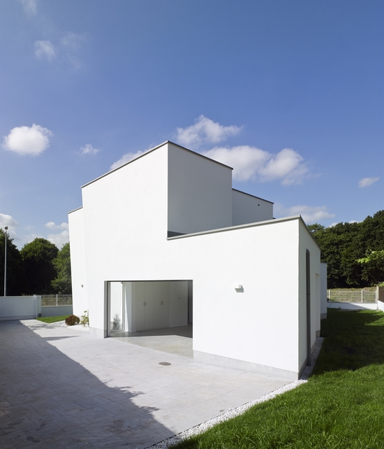 El resultado es una vivienda descompuesta en dos piezas separadas por una central que marca el acceso desde el exterior y la comunicación vertical a través de la escalera. Siguiendo las premisas de sus propietarios el programa se organiza en dos plantas: zona de día en planta baja junto con el garaje y zona de noche en planta primera. Se procura establecer un comunicación fluida,formal y continua entre todas las estancias, acentuándose con la utilización de un mínimo número de materiales. Las estancias principales se encuentran abiertas al paisaje a través de un generoso porche en voladizo y amplias aberturas que van de suelo a techo permitiendo trasparencia y comunicación visual con el exterior. Como contrapunto la casa se cierra al ámbito disperso residencial coincidiendo con la orientación menos soleada y más fría en Invierno.