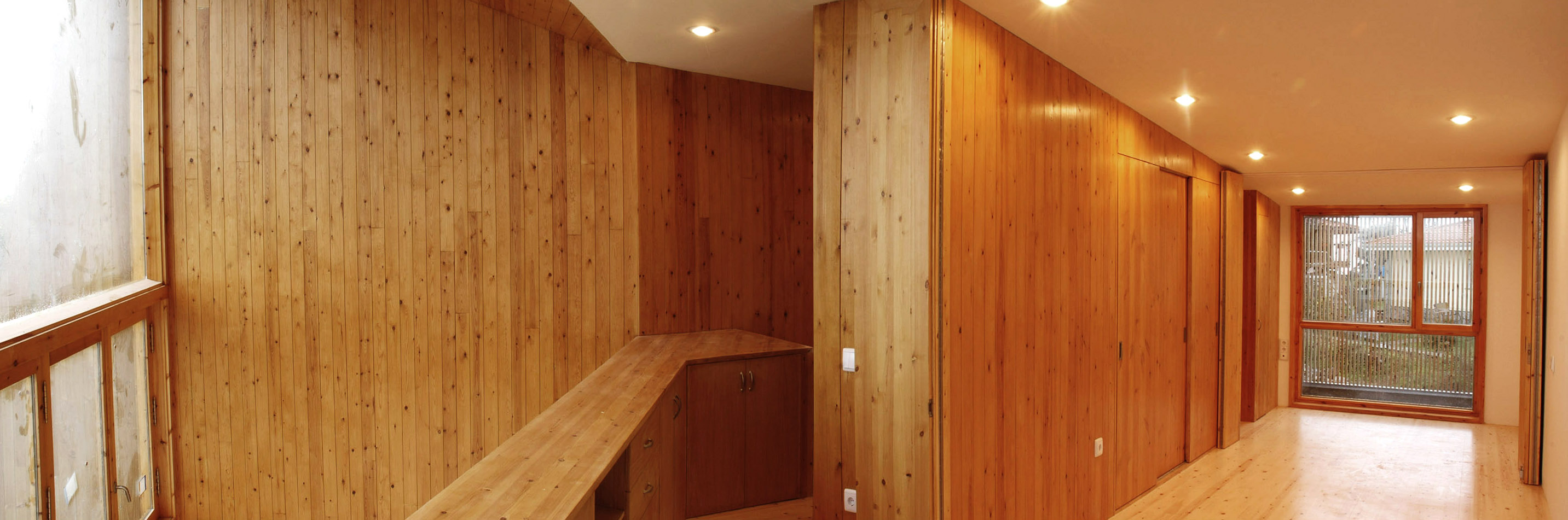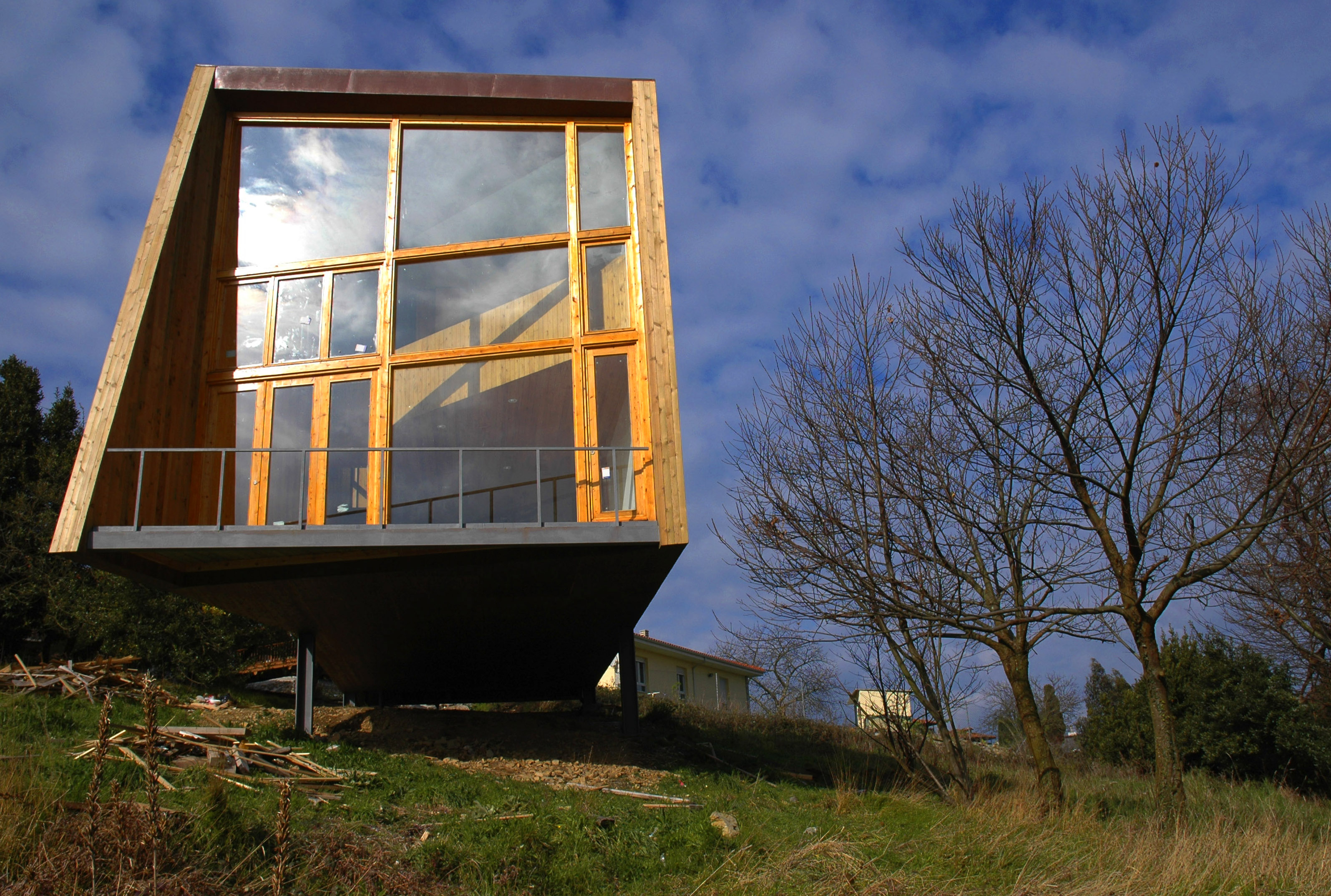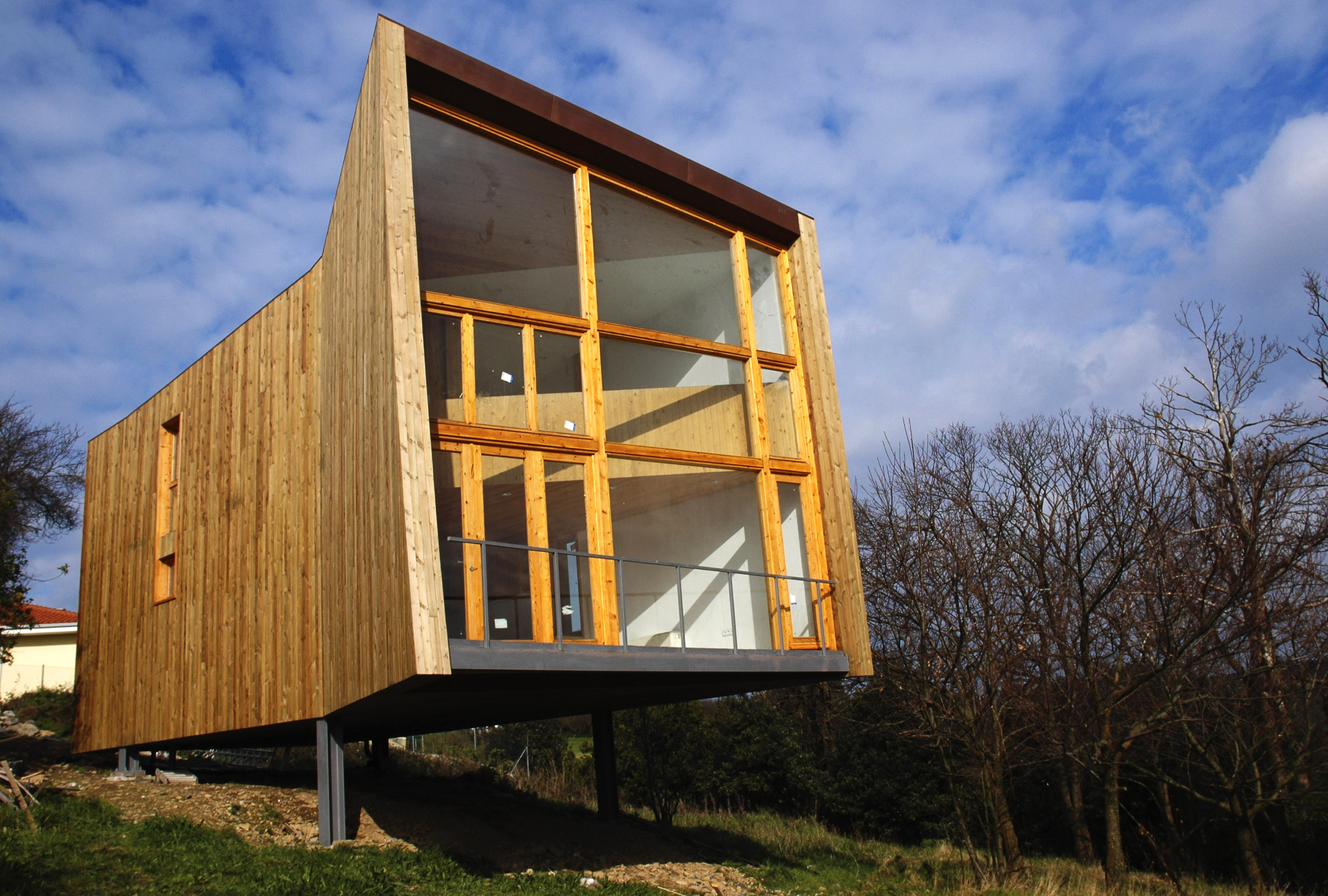 Implantación que se adapta a las condiciones climatológicas y que respeta íntegramente el arbolado de parcela. Minimiza su impacto en el terreno y en el paisaje, la construcción se despega del suelo y sólo apoya en cuatro puntos. Se mantiene la pendiente original, el manto verde del terreno vuelve a pasar bajo la vivienda sin nada que lo interfiera.Estructura mixta de acero y madera, desmontable y reciclable. Reversibilidad de la arquitectura. El cerramiento se resuelve mediante la combinación de dos tipos de madera (pino norte y pino douglas) con dos anchos distintos. Combinación aleatoria de elementos que integran la vivienda en el paisaje como la corteza de un nuevo árbol. Edificio que se mezcla con la naturaleza. Espacio adaptado a la climatología, proyectado sin instalación de calefacción ni refrigeración. Orientación, geometría y pliegues que se adaptan a la climatología, orientaciones solares. Apostamos por un espacio a doble altura acristalado en su totalidad y orientado hacia el sur. Sustituimos un sistema convencional de lamas orientables como obstrucción solar por un sistema de huecos practicables de distintas posiciones y combinaciones que actúa como regulador higrotérmico, y que responde más adecuadamente al microclima del lugar. Fachadas de mayor superficie casi totalmente ciegas evitando pérdidas térmicas. Huecos de ventilación en todas las orientaciones. Ventilación cruzada de todos los espacios. La fachada norte se protege mediante un espacio previo y una celosía cortavientos. La doble altura no se concibe con fines espaciales o compositivos, es un dispositivo bioclimático fundamental para regular el funcionamiento térmico de la vivienda. Actúa como foco regulador de temperatura. Espacio compacto, optimización del factor de forma. Flexibilidad funcional, vivienda transformable y compartimentable temporalmente (la planta baja integra distintos usos en un espacio único que puede ser configurado por el usuario de distintas maneras, la planta alta puede transformarse desde en un único dormitorio hasta dos o tres).» Memoria de proyecto. Ecosistema Urbano |