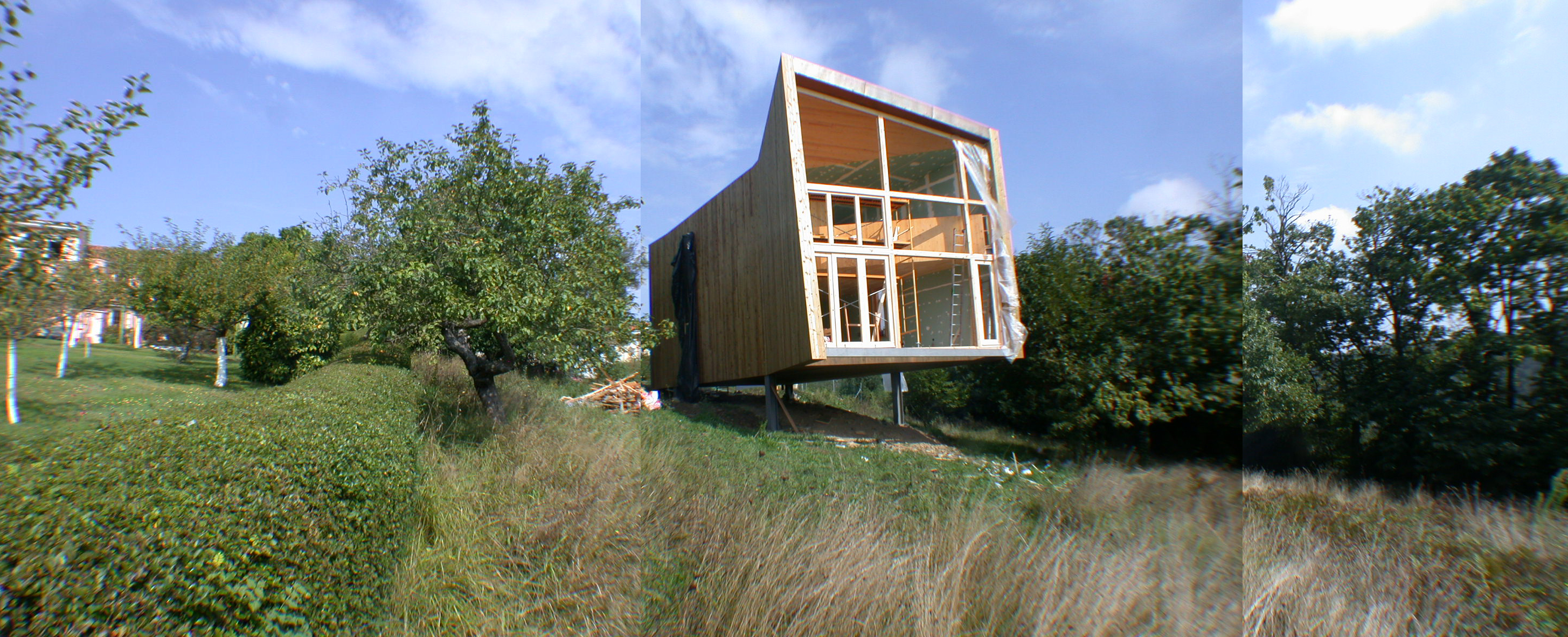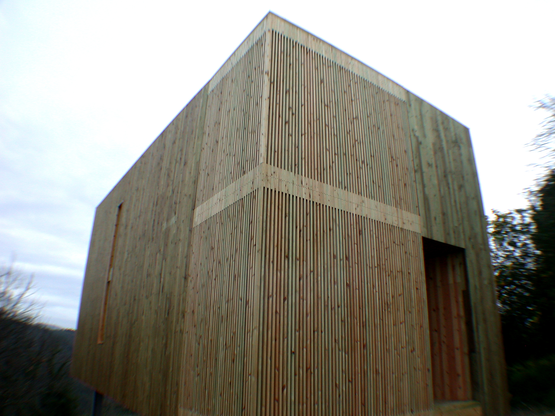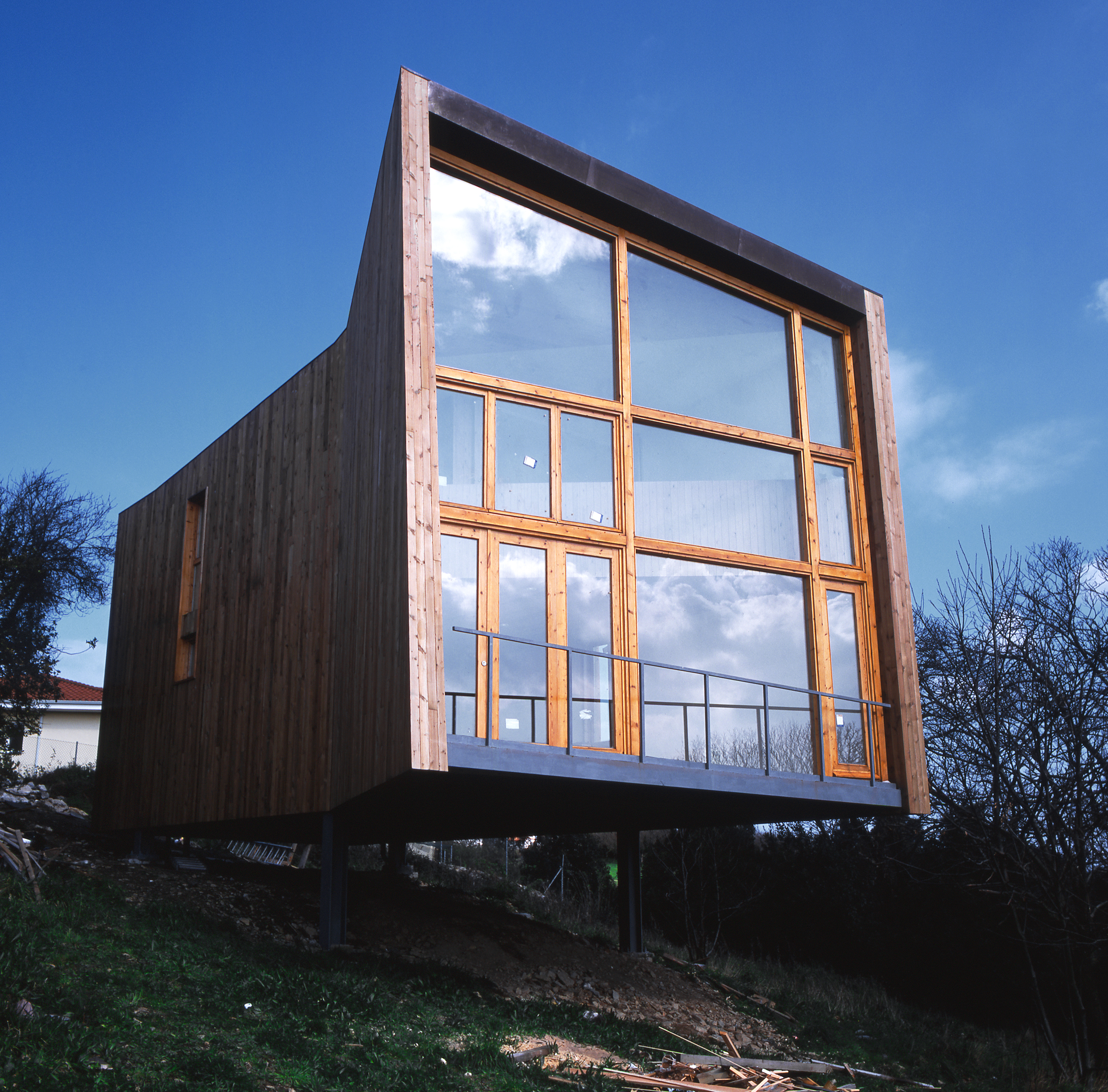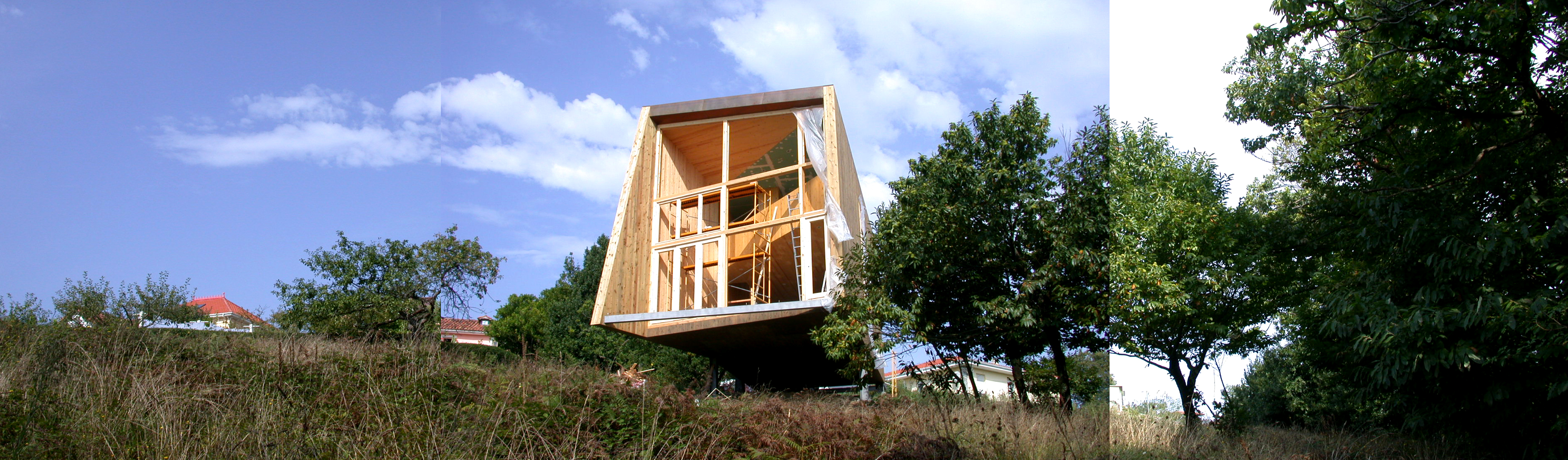 Implantación que se adapta a las condiciones climatológicas y que respeta íntegramente el arbolado de parcela. Minimiza su impacto en el terreno y en el paisaje, la construcción se despega del suelo y sólo apoya en cuatro puntos. Se mantiene la pendiente original, el manto verde del terreno vuelve a pasar bajo la vivienda sin nada que lo interfiera.Estructura mixta de acero y madera, desmontable y reciclable. Reversibilidad de la arquitectura. El cerramiento se resuelve mediante la combinación de dos tipos de madera (pino norte y pino douglas) con dos anchos distintos. Combinación aleatoria de elementos que integran la vivienda en el paisaje como la corteza de un nuevo árbol. Edificio que se mezcla con la naturaleza. Espacio adaptado a la climatología, proyectado sin instalación de calefacción ni refrigeración. Orientación, geometría y pliegues que se adaptan a la climatología, orientaciones solares. Apostamos por un espacio a doble altura acristalado en su totalidad y orientado hacia el sur. Sustituimos un sistema convencional de lamas orientables como obstrucción solar por un sistema de huecos practicables de distintas posiciones y combinaciones que actúa como regulador higrotérmico, y que responde más adecuadamente al microclima del lugar. Fachadas de mayor superficie casi totalmente ciegas evitando pérdidas térmicas. Huecos de ventilación en todas las orientaciones. Ventilación cruzada de todos los espacios. La fachada norte se protege mediante un espacio previo y una celosía cortavientos. La doble altura no se concibe con fines espaciales o compositivos, es un dispositivo bioclimático fundamental para regular el funcionamiento térmico de la vivienda. Actúa como foco regulador de temperatura. Espacio compacto, optimización del factor de forma. Flexibilidad funcional, vivienda transformable y compartimentable temporalmente (la planta baja integra distintos usos en un espacio único que puede ser configurado por el usuario de distintas maneras, la planta alta puede transformarse desde en un único dormitorio hasta dos o tres).» Memoria de proyecto. Ecosistema Urbano |