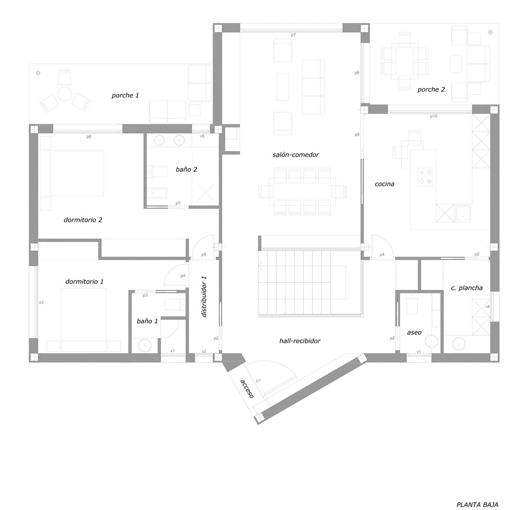 El acceso a la vivienda en planta baja está definido por un volumen que sobresale del plano de fachada y adquiere un giro respecto a la alineación de dicha fachada. Entramos a un amplio vestíbulo presidido por la escalera que da acceso a la planta sótano y planta primera. Desde el vestíbulo tenemos acceso hacia la zona de dormitorios en el ala este de la vivienda formado por dos habitaciones, una orientada al norte y otra al sur, con sus respectivos baños incorporados. La habitación que da al sur tiene salida directa al exterior a través de un porche. En el ala oeste se ubica orientado al norte una zona de servicio compuesta por cuarto de lavado, aseo y ropero; y orientado al sur una amplia cocina comunicada directamente con el salón-comedor que ocupa toda la zona central de la vivienda. El salón-comedor y la cocina tienen salida directa al exterior a través del mismo porche.