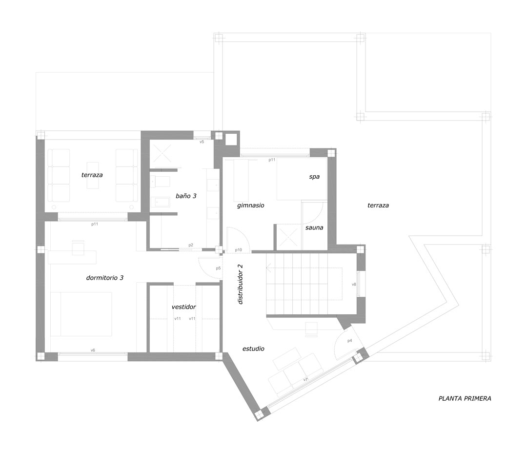 En planta alta desembarcamos en un pequeño distribuidor que nos lleva al sur hacia el gimnasio comunicado con una amplia terraza orientada al sur-oeste; al norte y ocupando el mismo volumen que el acceso de planta baja nos encontramos un estudio; y al este el dormitorio principal con vestidor y baño incorporados y salida a una terraza orientada al sur.
