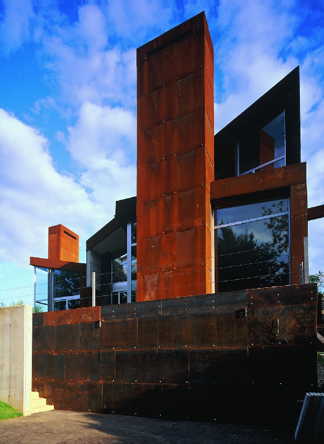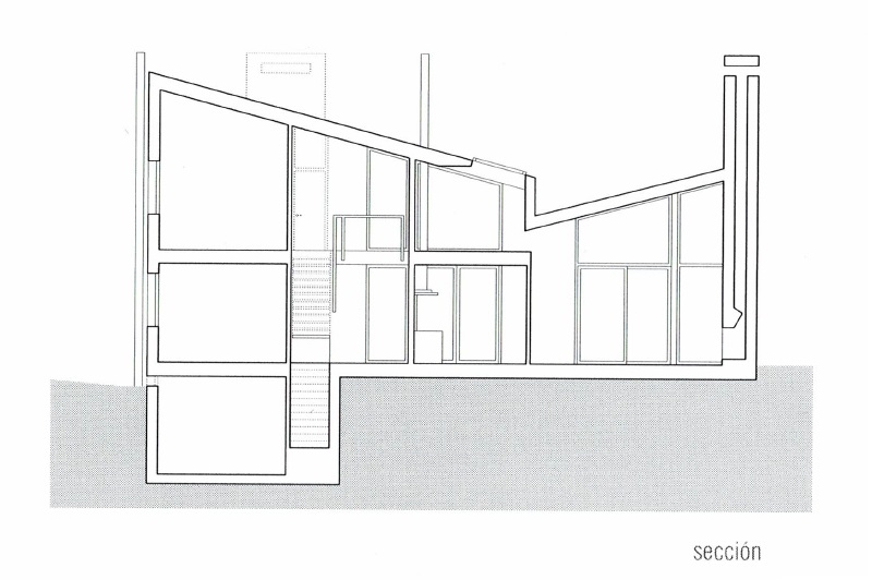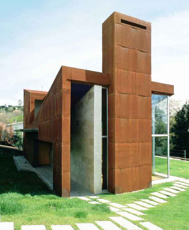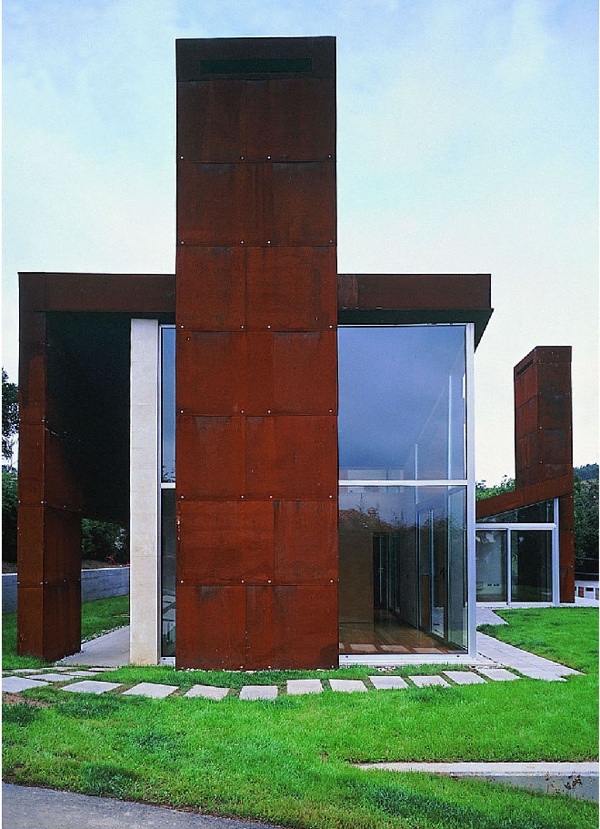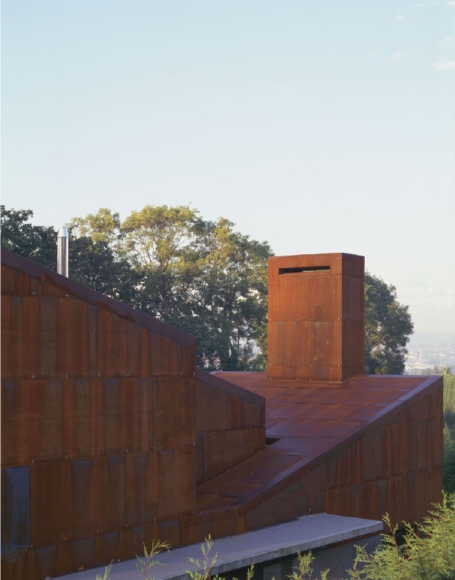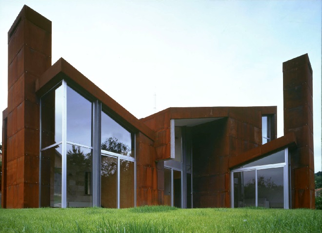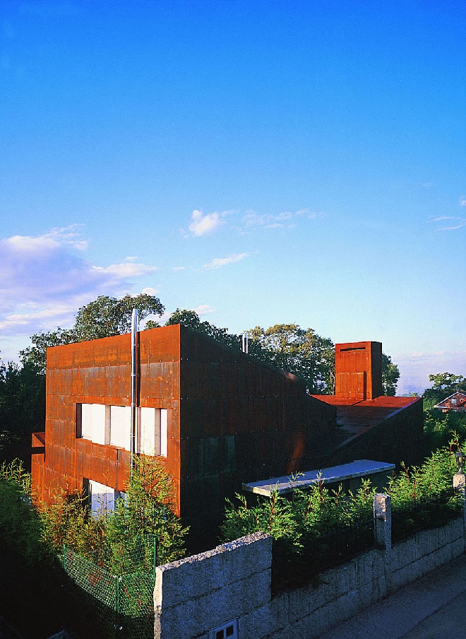 | La vivienda se desarrolla mediante una planta en L, buscando el soleamiento del suroeste. Debido a la topografía de la parcela, a media ladera, el terreno es resuelto mediante un muro de hormigón visto que delimita una plataforma verde sobre la que se erige la edificación. Mientras que el exterior de la vivienda se muestra opaco en el norte, donde se sitúa el acceso, los grandes paños acristalados en los alzados interiores de la L provocan una continuidad entre los espacios interior y exterior, diluyéndose así el límite entre el espacio cerrado y el jardín, la naturaleza del entorno y las vistas. Las fachadas se resuelven con chapa de acero corten, incluida la cubierta, en la que se pone en práctica la idea de la quinta fachada, visible desde la vía de acceso. Así, el arquitecto aprovecha tanto las propiedades de este material como su aspecto superficial, de un color rojizo-anaranjado muy característico. La elección de este material, junto a la forma exterior del edificio, que destaca por sus cubiertas plegadas y la fuerte presencia de sus chimeneas, ayuda a transmitir la idea del edificio como escultura, como objeto artístico. Esa expresividad exterior es llevada también al interior, donde la rugosidad del acero corten se sustituye por la calidez de la madera combinada con paños grises, blancos y azul intenso. | ||