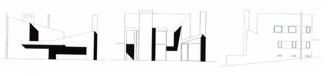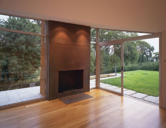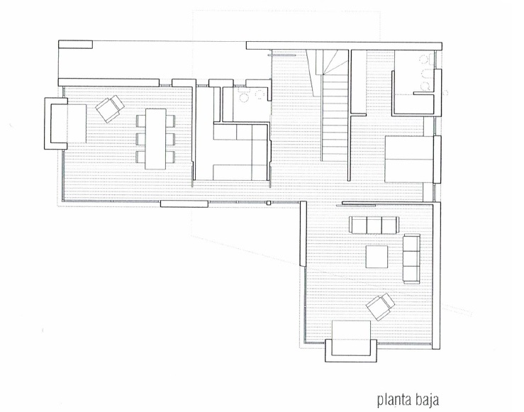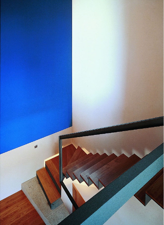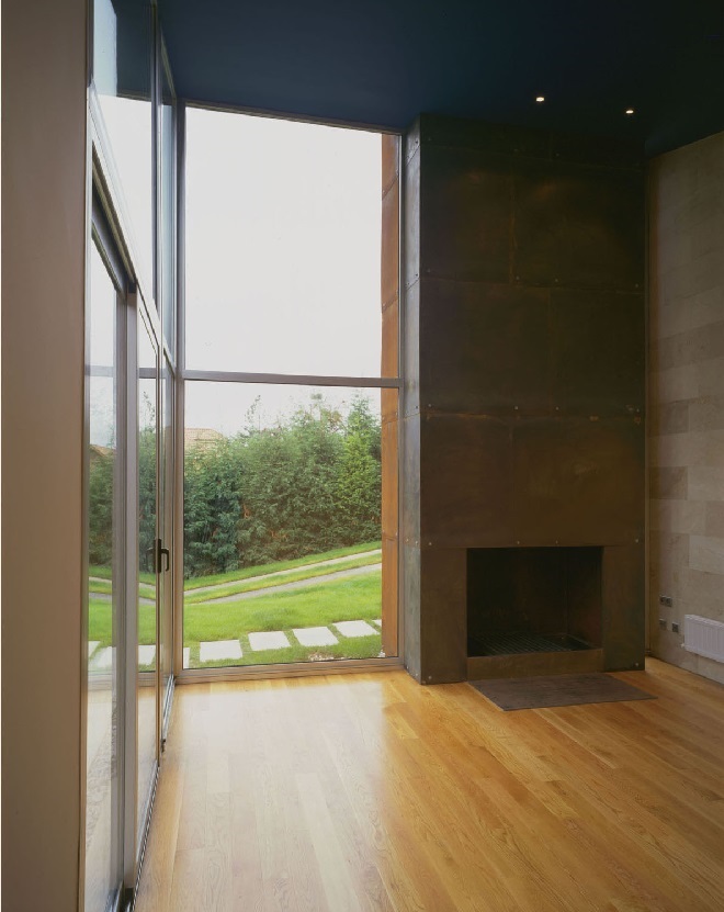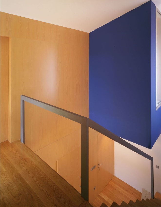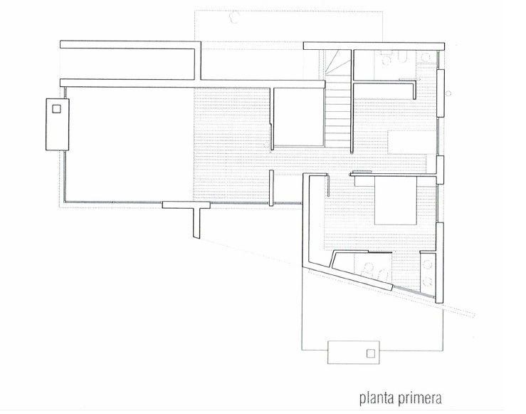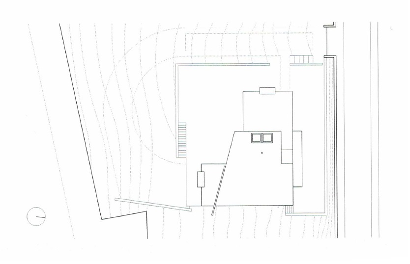 | La vivienda se desarrolla mediante una planta en L, buscando el soleamiento del suroeste. Debido a la topografía de la parcela, a media ladera, el terreno es resuelto mediante un muro de hormigón visto que delimita una plataforma verde sobre la que se erige la edificación. Mientras que el exterior de la vivienda se muestra opaco en el norte, donde se sitúa el acceso, los grandes paños acristalados en los alzados interiores de la L provocan una continuidad entre los espacios interior y exterior, diluyéndose así el límite entre el espacio cerrado y el jardín, la naturaleza del entorno y las vistas. Las fachadas se resuelven con chapa de acero corten, incluida la cubierta, en la que se pone en práctica la idea de la quinta fachada, visible desde la vía de acceso. Así, el arquitecto aprovecha tanto las propiedades de este material como su aspecto superficial, de un color rojizo-anaranjado muy característico. La elección de este material, junto a la forma exterior del edificio, que destaca por sus cubiertas plegadas y la fuerte presencia de sus chimeneas, ayuda a transmitir la idea del edificio como escultura, como objeto artístico. Esa expresividad exterior es llevada también al interior, donde la rugosidad del acero corten se sustituye por la calidez de la madera combinada con paños grises, blancos y azul intenso. | ||
